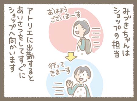 みづきちゃんはショップの担当、アトリエに出勤するとあいさつをしてすぐにショップに向かいます