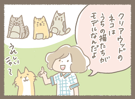 ゆきちゃん「クリアウッドのネコはうちの猫たちがモデルなんです!(左からゴマ・どらやき部長・モモ)」