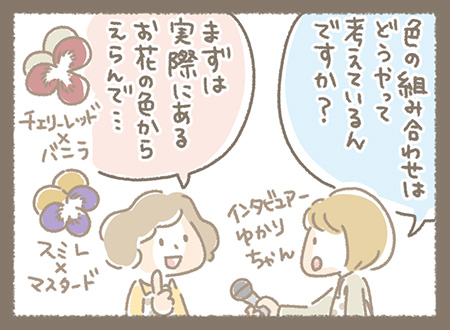 ゆきちゃん「まずは実際にあるお花の色からえらんで・・・そのうえで実際にはないけどあったらかわいいなって思う、ネイビー×ピュアグレー,バビーピンク×クモリゾラ,アッシュグレー×バニラのような色の組み合わせを出してみたんだよ」