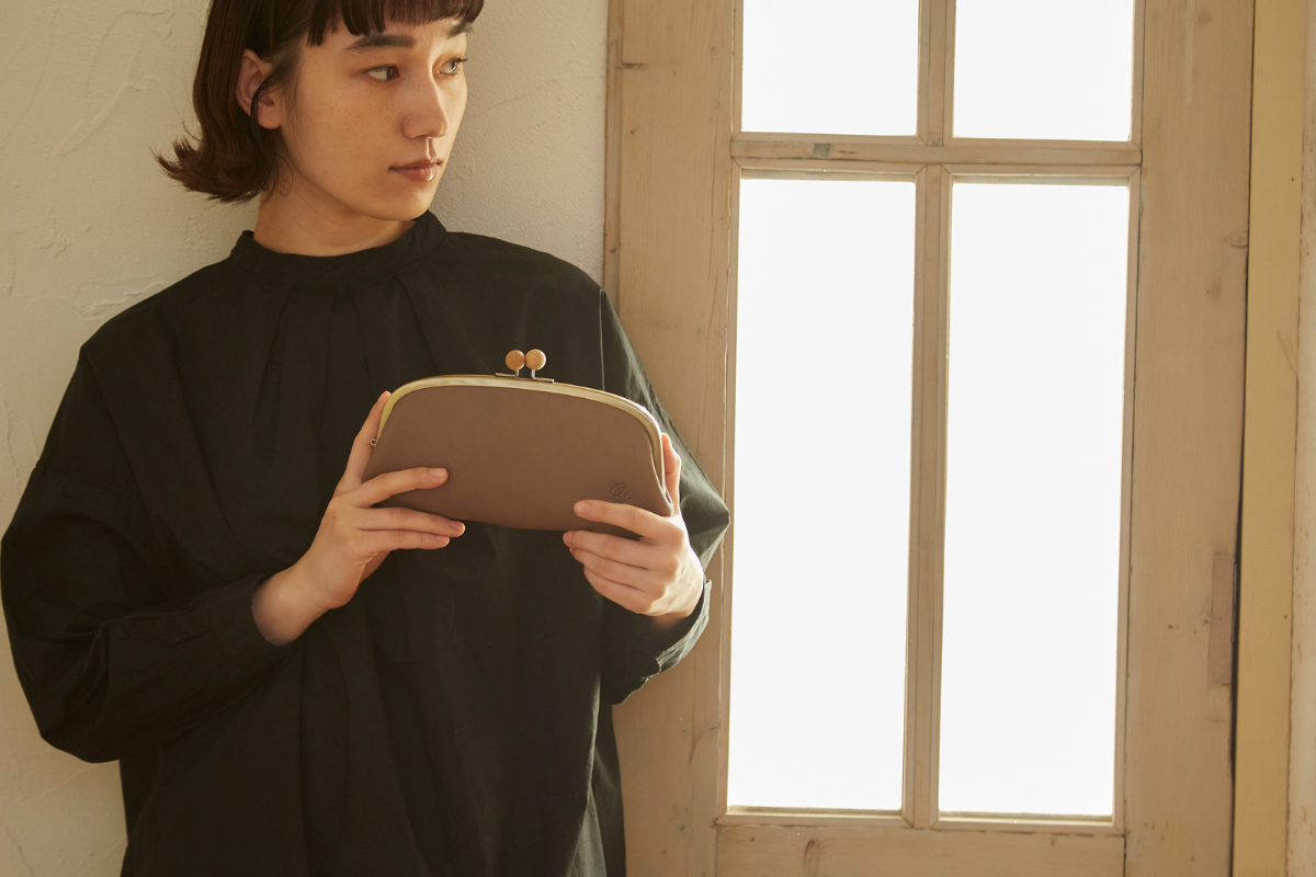 「ドロップツリー木玉 ロング がま口 ウォレット」は、同じくすっぴんレザーをつかったがま口の長財布。しもぶくれフォルムと桜の木のつまみが、なんとも柔らかで丸い雰囲気です。ふつうのがま口と違って、ポコンという木玉のがま口の開閉音は、こちらも柔らかい響き。