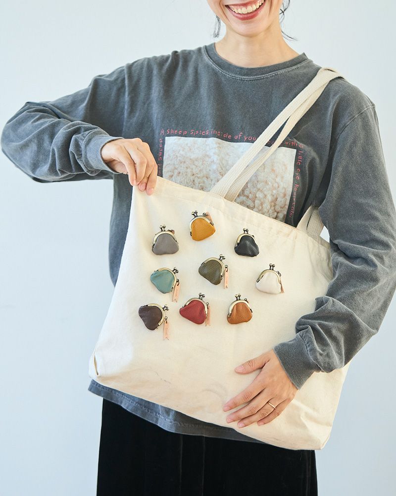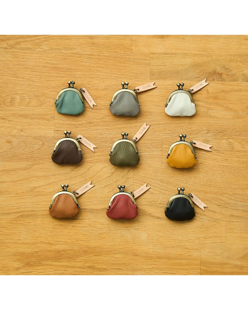 小さながま口は、ずらりと9色。ぴぴっときた色が、あなたのおまもりカラーかも。 元気をくれるレッドは、パッと目立ってバッグのアクセントに。落ち着きと安心感をくれる深みのあるグリーン。毎日を爽やかにしてくれそうな、澄んだ空のようなキャットブルー。やさしく寄り添うナチュラルカラーのクリーム。持つだけで気分も華やかになりそうな、明るく温かなマスタード。シックで大人っぽく、どんなバッグにも似合うブラック。上品で落ち着いたニュアンスカラーのピュアグレー。重厚感のあるダークブラウンは、じっくりと革の深みを楽しめます。甘くやわらかなキャラメルは、手に取るたびにほっとする色。どの色が気になりますか?