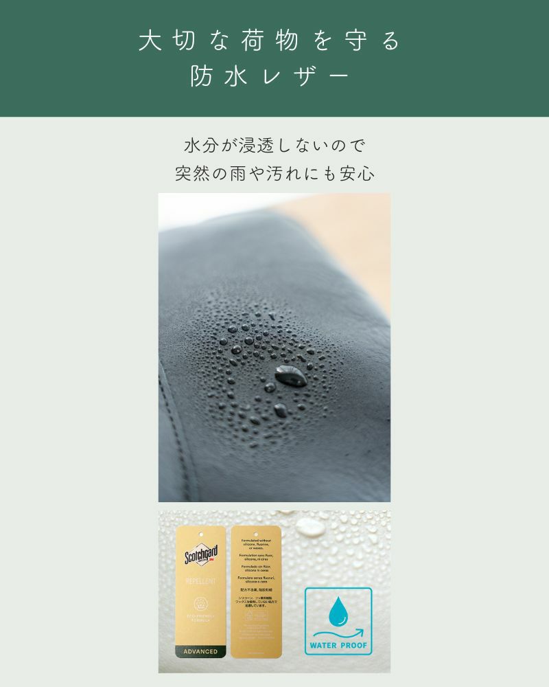 どんなお天気の日も、革のバッグを使えます!水分がしみ込まないので、水ぬれやよごれを弾いて、お手入れがラクちんです。うっかり飲み物をこぼしてしまっても大丈夫◎ささっと拭いて、元通り。お子さま連れのお出かけにもおすすめです。シンプルなデザインで、男女ともにお使いいただけるアイテムが揃っています!