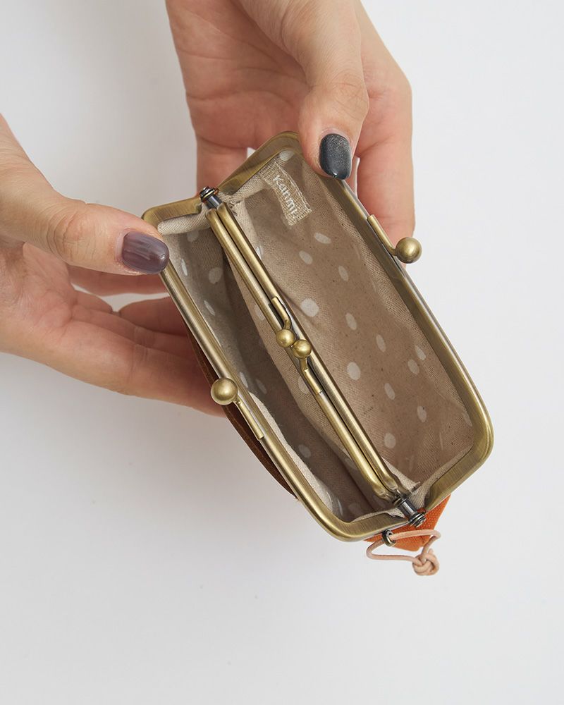 2つ折りにしたお札が入るサイズなのでお財布としても使えます。小さいがま口には小銭を。カードもたっぷり入るので、人と違うお財布を探している方におすすめです。