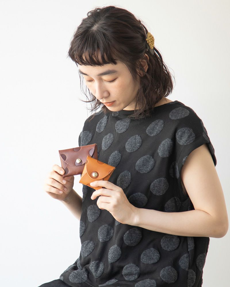 コインケースとサイズ違いのドット柄の封筒型カードケース。半円のカーブと全体に散りばめられたドットがかわいらしく、カードを取り出すたびに楽しい気持ちに。 厚手のカードなら15枚、名刺は20枚くらい収納できます。