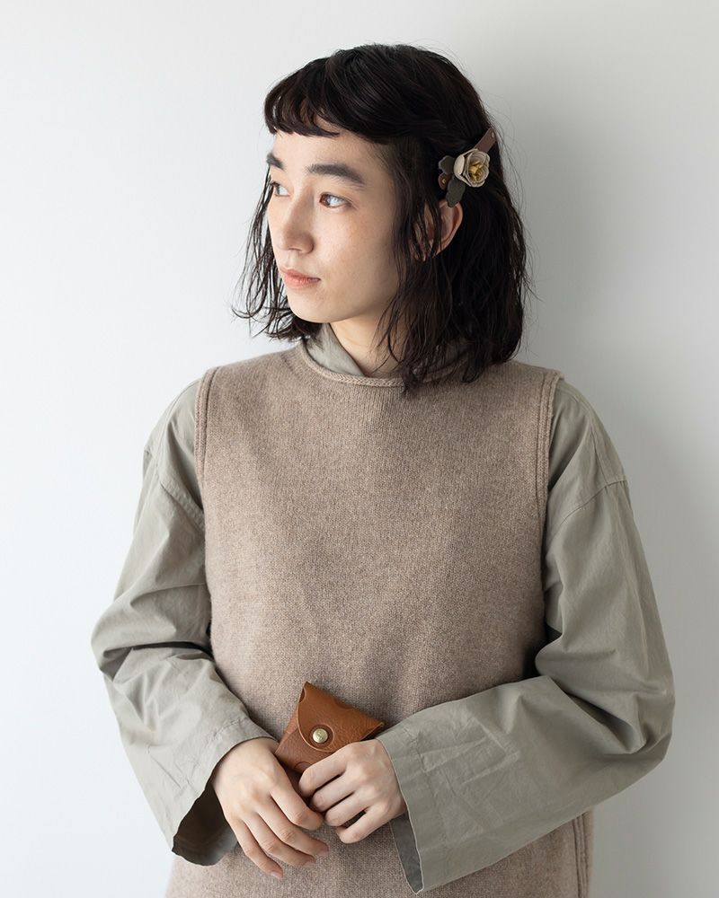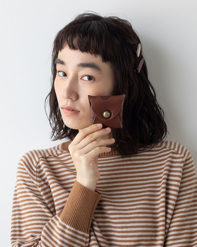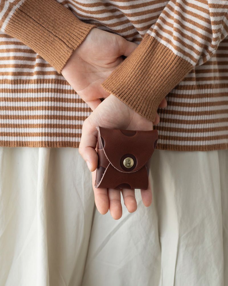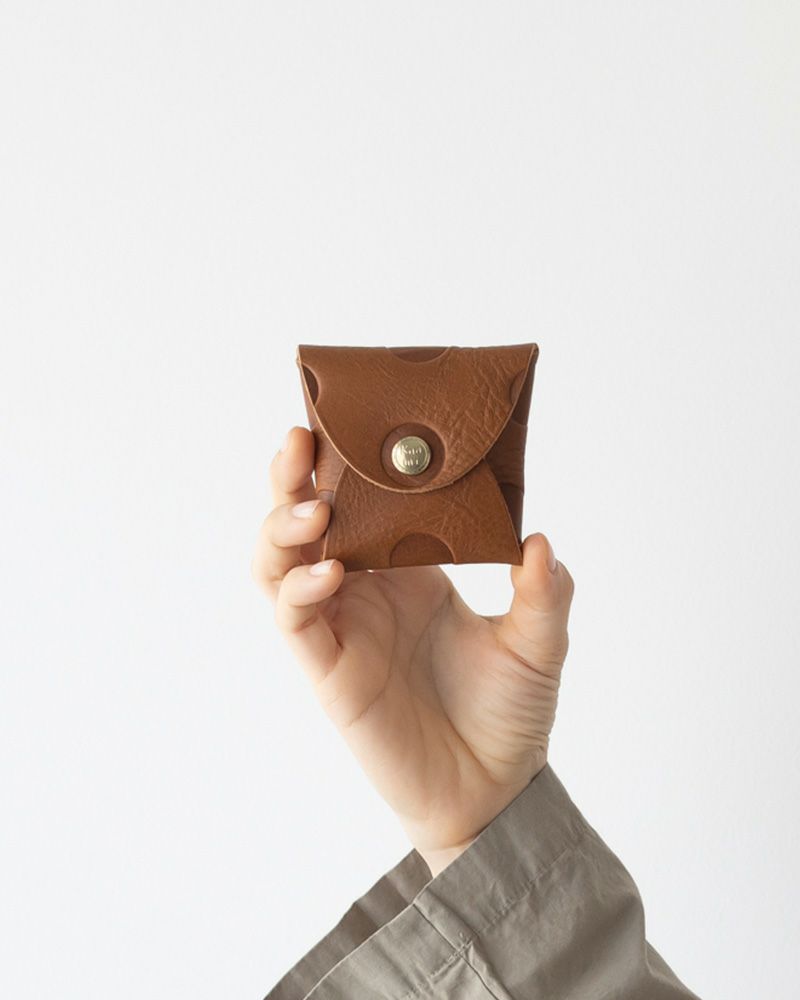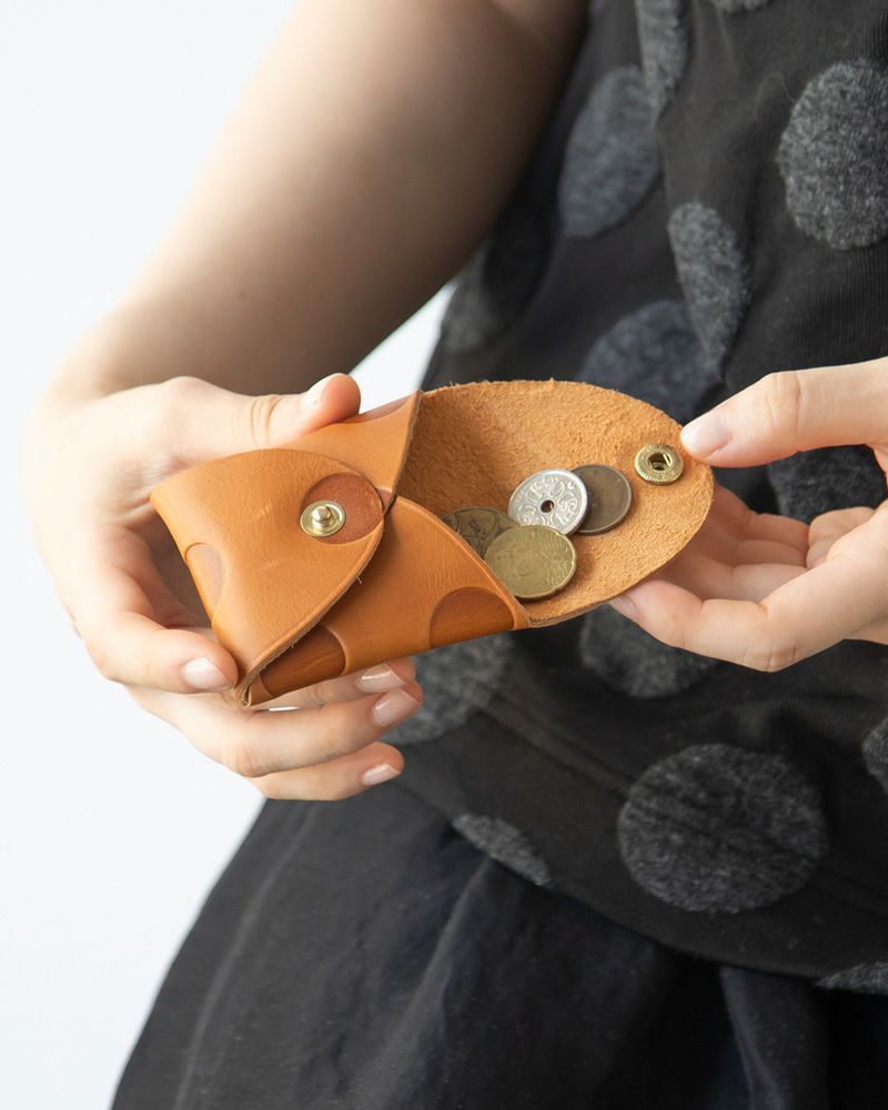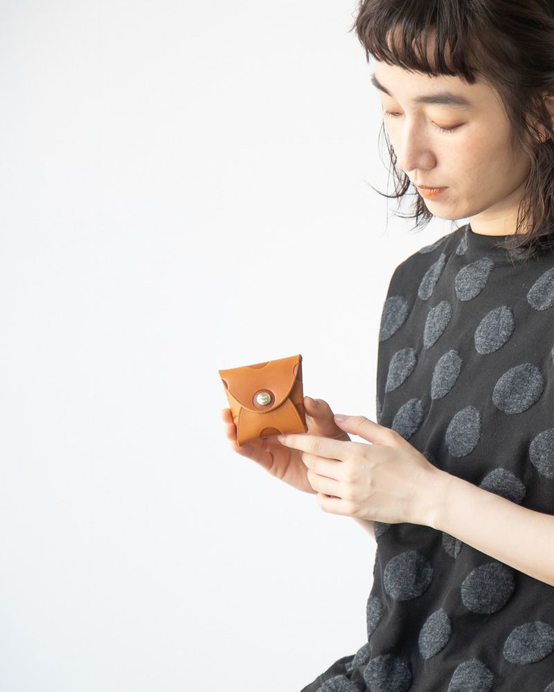 一枚革の左右と下を織り込んで、どこも縫わずに真鍮ボタンで止めた封筒のような小銭入れ。ボタンに押されたKanmi.のロゴがワンポイントに。手のひらにすっぽりおさまるコンパクトさが、愛着を感じさせてくれます。底の幅が少し狭くなっていて、ささっと左右に揺らすとコインが手前に出てきます。蓋にコインを広げれば、中身が見えやすく支払いもスムーズ。