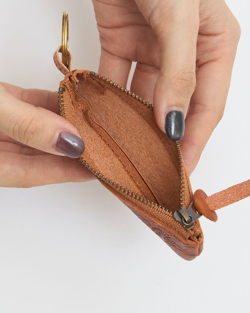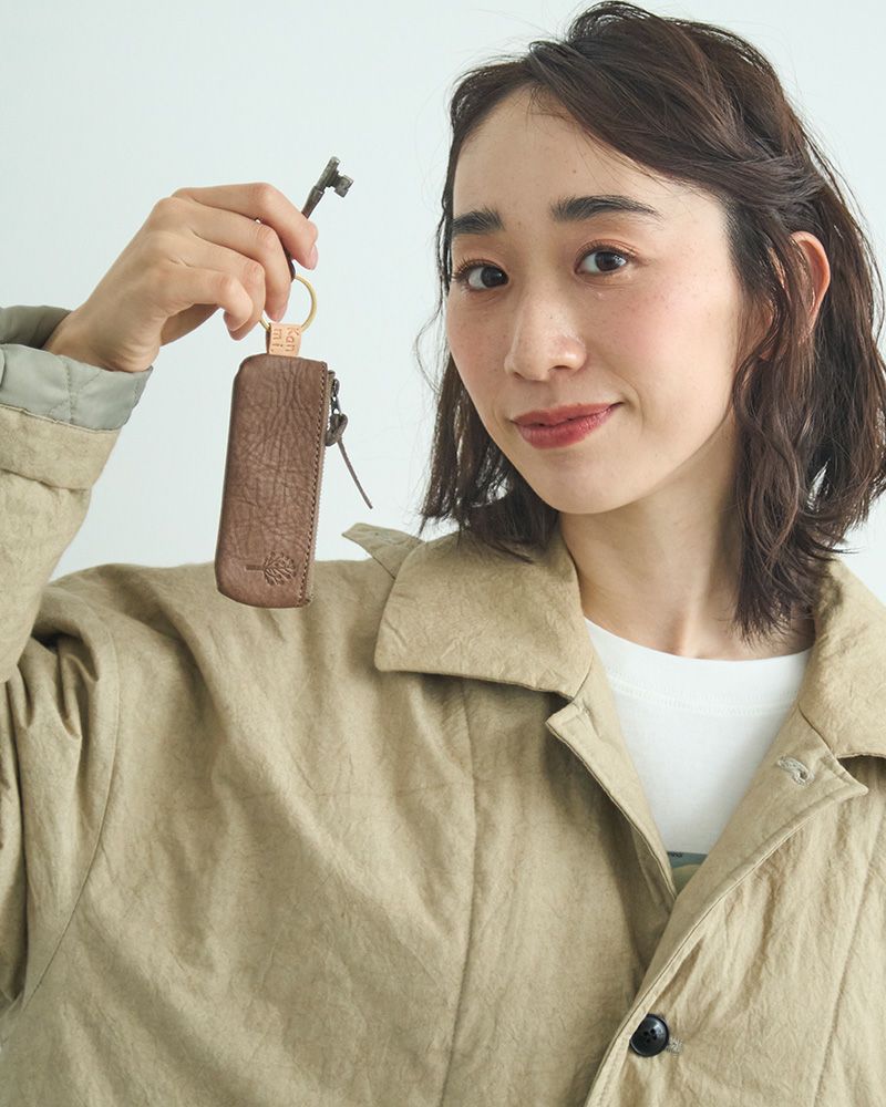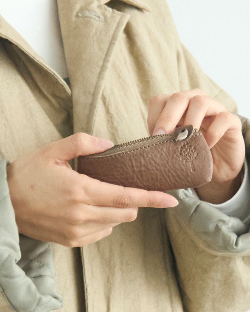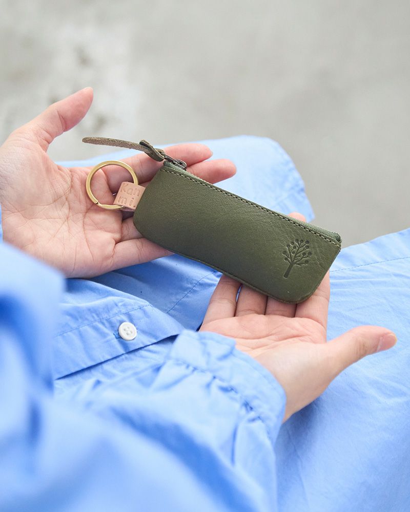 横長のポーチの右側にはドロップツリーが。キーリングとポーチを繋ぐヌメ革に押されたKanmi.のロゴも目立ちすぎずさりげないアクセントになっています。
