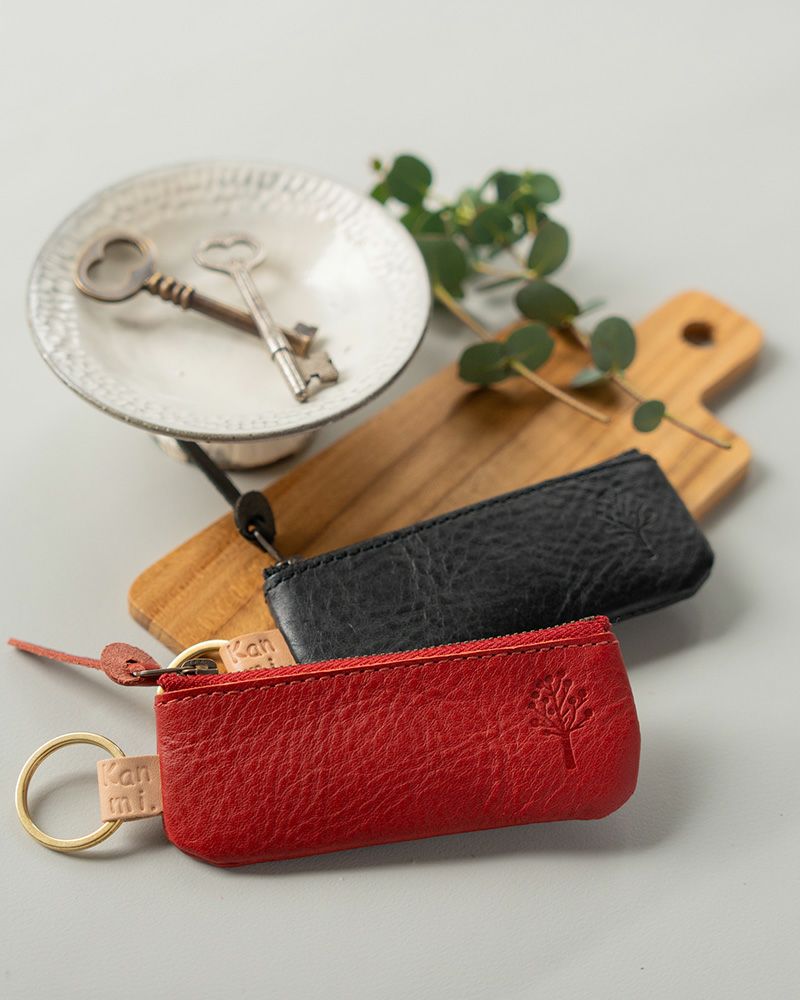 レッド、グリーン、クロ、グレー、ダークブラウン、キャメルの6色。レッドやグリーンも落ち着いた色合いなので、毎日にしっとり馴染んでくれます。そっと暮らしに寄り添ってくれる優しい色たちです。 1つで3役な「ドロップツリー ポーチキーリング」