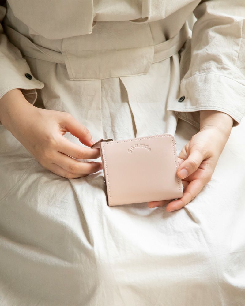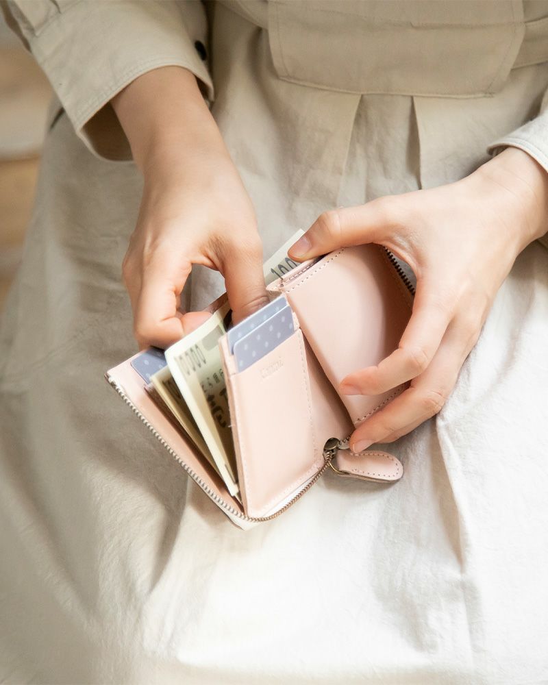 box型の小銭入れが使いやすそうで購入しました。ベビーピンクを購入しましたが、suamaというお菓子をイメージした色らしく、ふわっとした淡い色味でかわいいです。お札を入れる所にスリットが入っているので、出し入れもしやすいです。box型小銭入れも取り出しやすく、持ち歩いていてもジャラジャラ音が鳴らず良きです。クレカと免許証、少しの現金を持ち歩きたい自分には理想の財布です。ただ、革の質感はツルッとしているというか、お菓子のすあまをイメージして勝手にサラッとした質感をイメージしていましたが、ニス塗りした用なテカテカした質感でした。