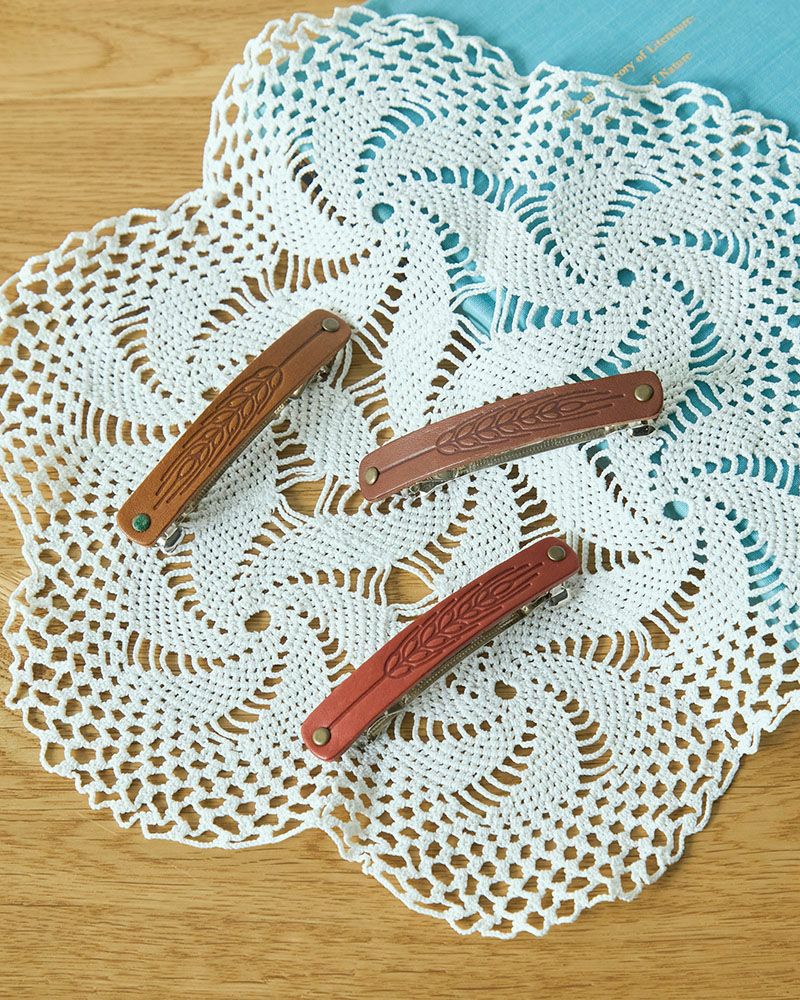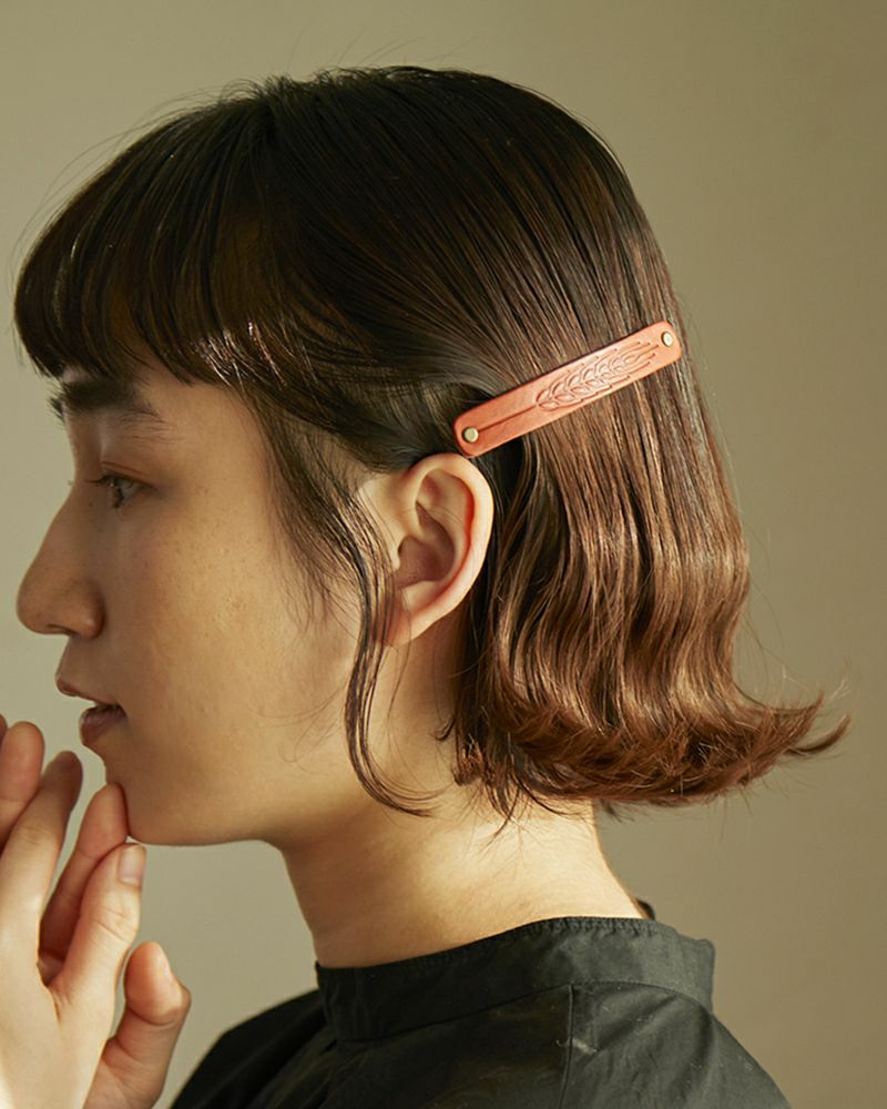 柔らかいレザーに麦のイラストを型押しした、シンプルなデザインのバレッタ。細幅で、すっきりとした印象でお使いいただけます。マットなレザーが落ち着いた雰囲気を演出するので、派手なモチーフがNGのお仕事シーンでも活躍するアイテムです。