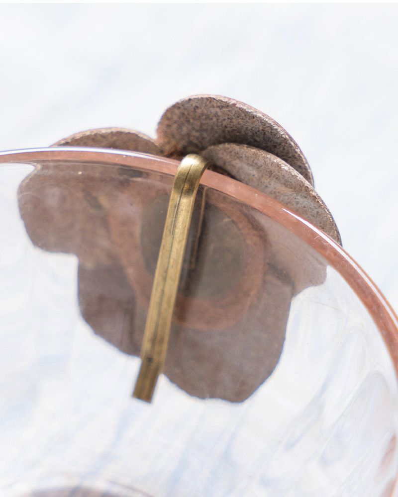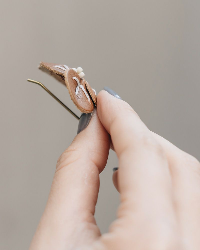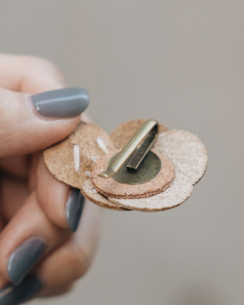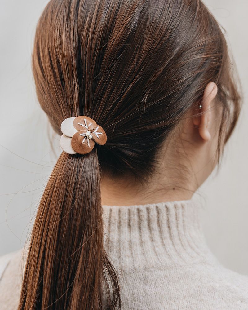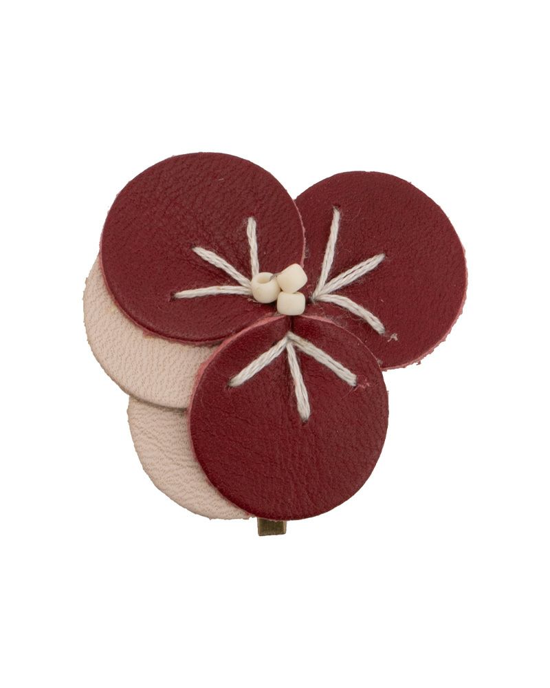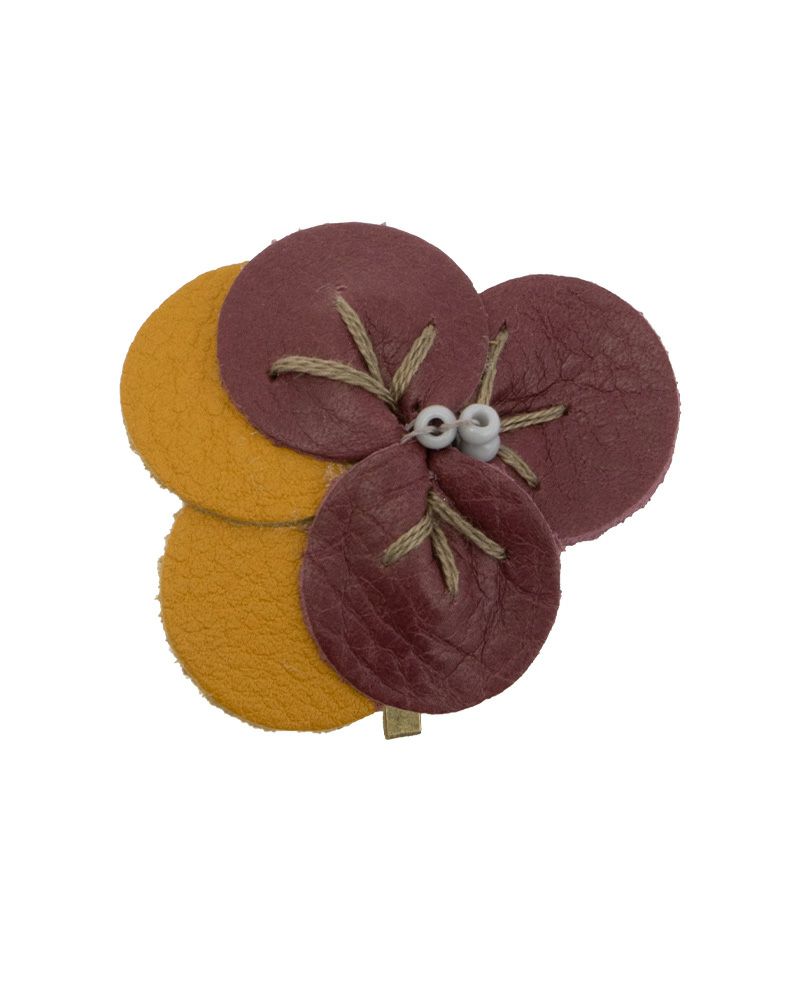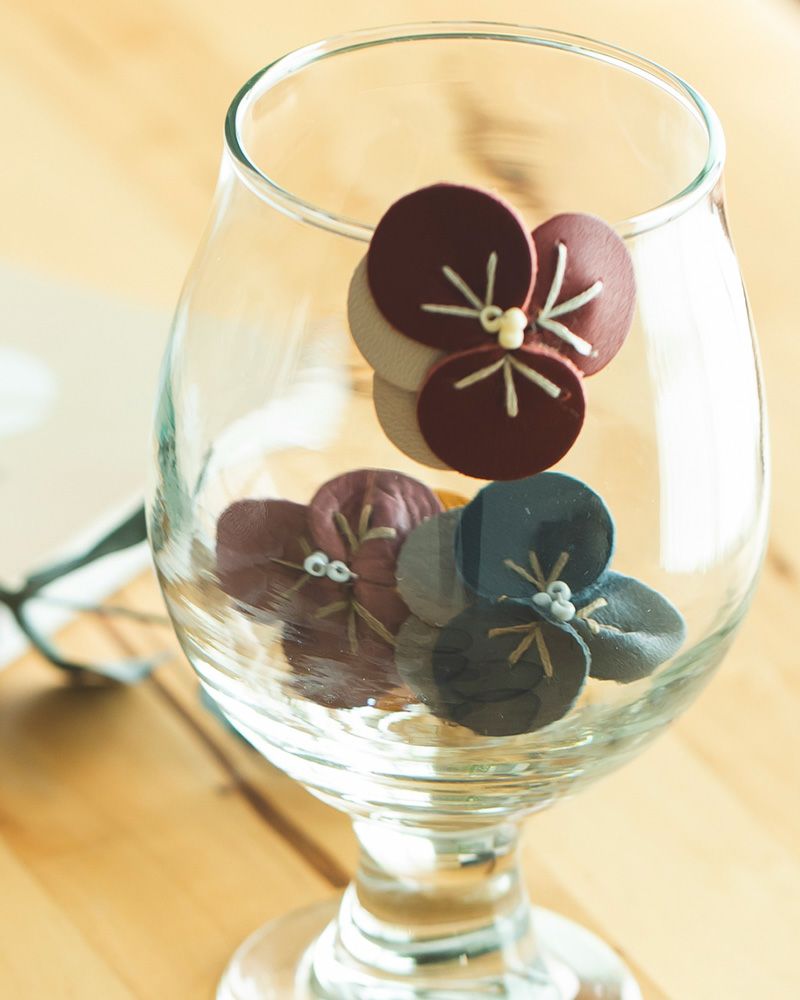 2色の革の花びらに組み合わせたビーズと刺繍糸。やさしい色で毎日を楽しい気分にしてくれます。