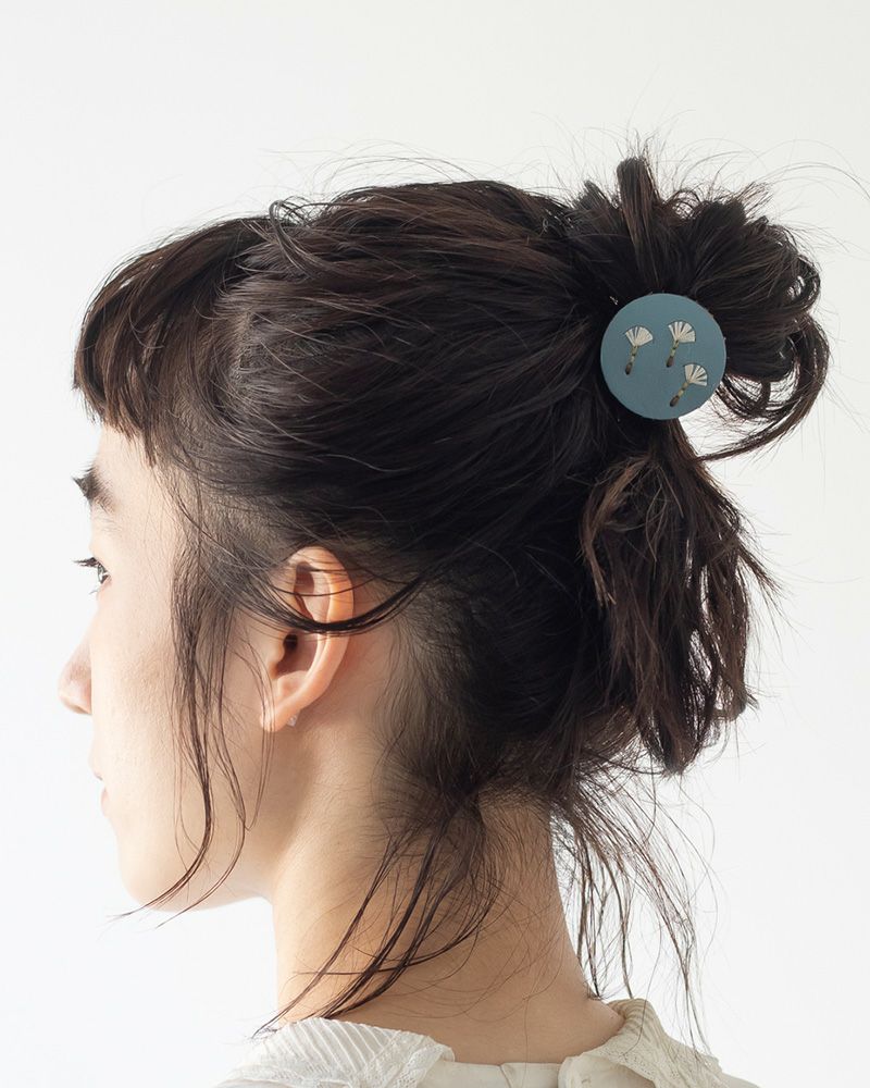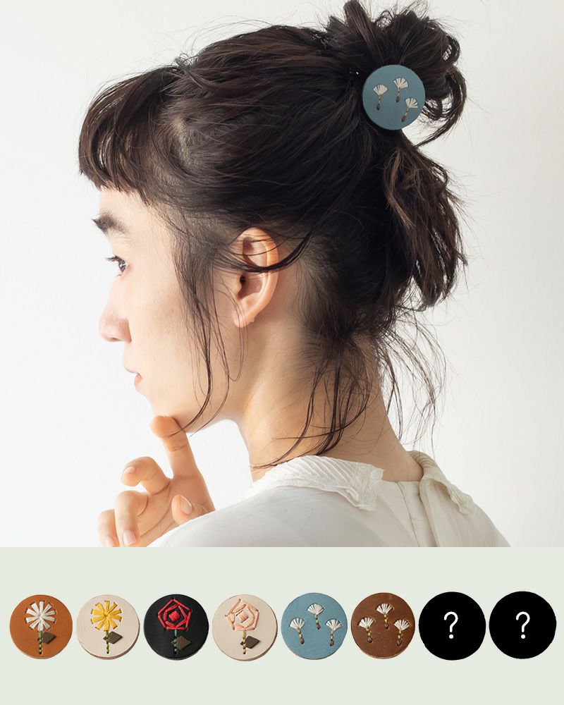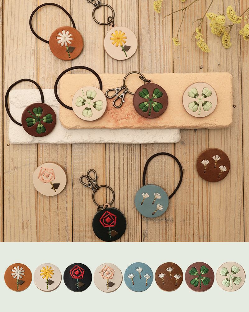 同じ刺繍と革を使ったアイテムは、ヘアゴム、ブローチ、キーリングの3種類。ヘアゴムとブローチなど、アイテム違いで同じ図案を集めればお揃いコーディネートが楽しめます。色や図案の組み合わせでナチュラルかわいくなったり、ニュアンスカラーで大人っぽい雰囲気にも。あなたのお気に入りの組み合わせを見つけてくださいね。