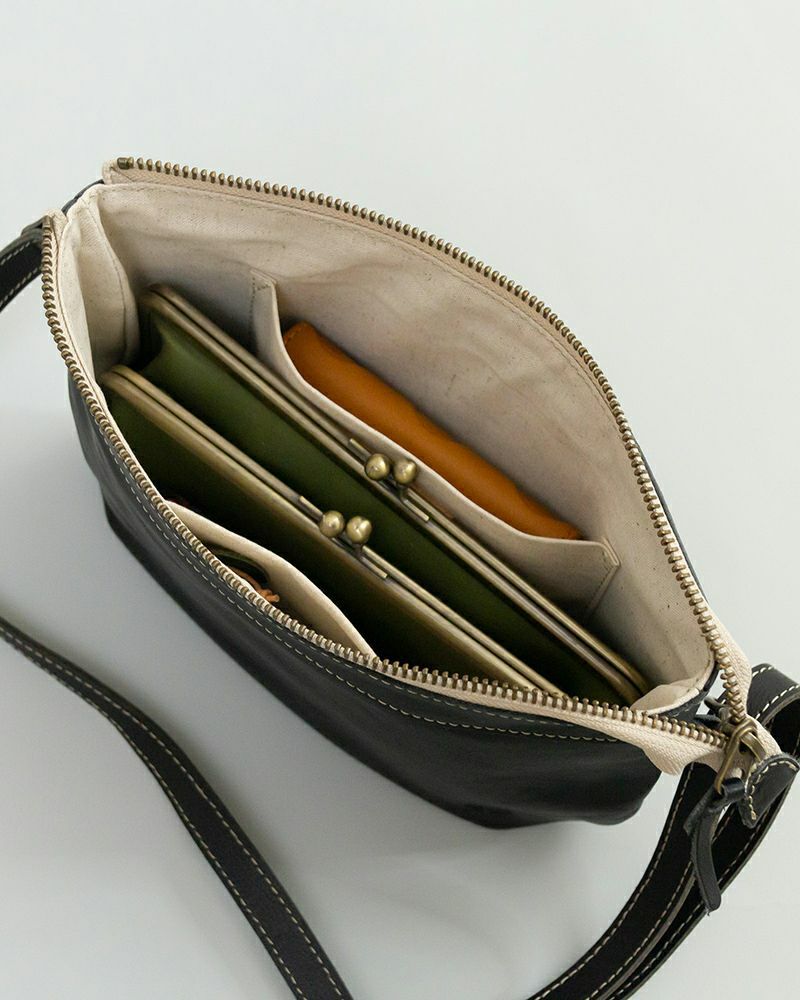 バッグインバッグみたいにいつものメインバッグに入れておいて、会社や旅先からちょっと外出するときなどにもぴったり。 ファスナーの端っこを外に出すことで、開きをよくしました。お支払いの時やスマホをチェックしたいとき、もたつくことなくスムーズに。