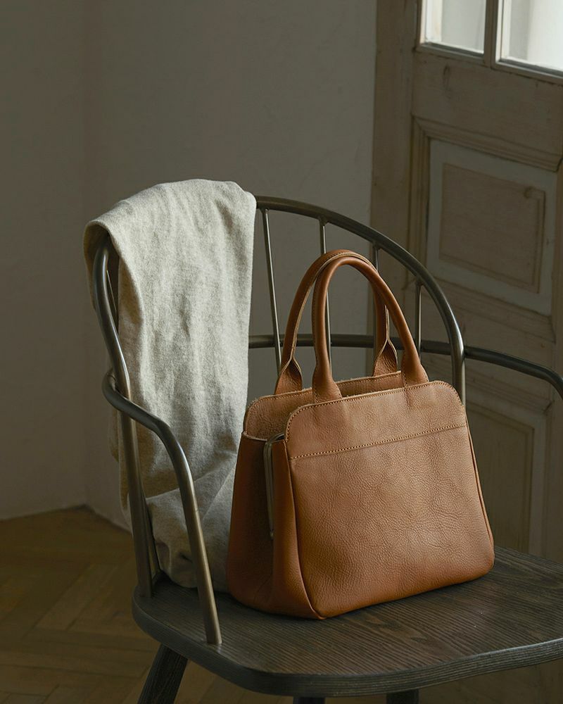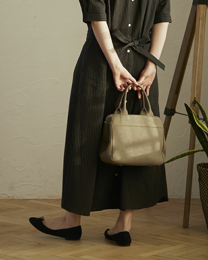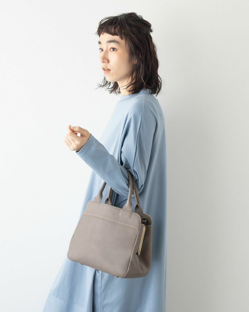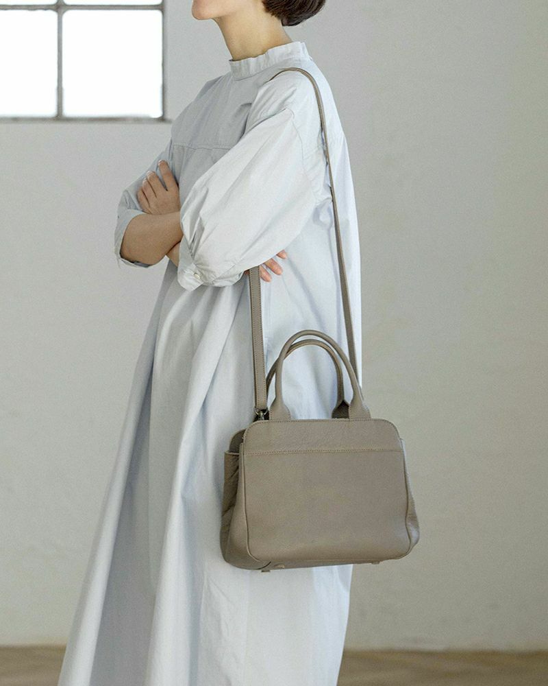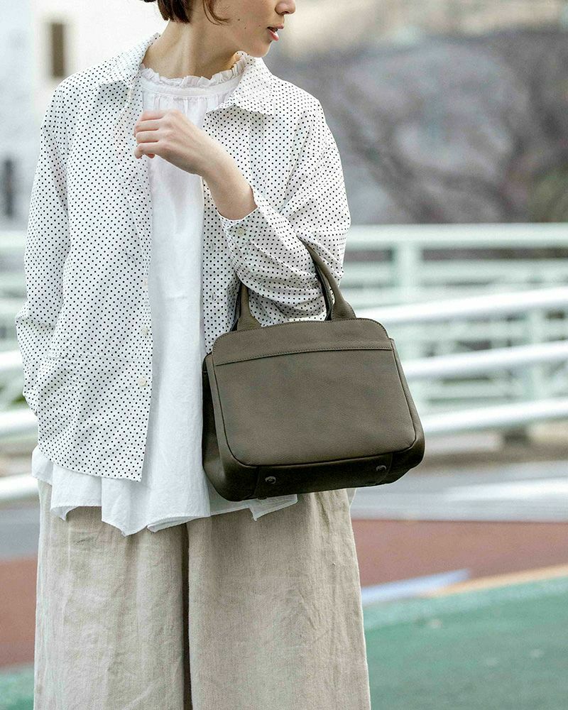 きちんと感がしっかり出るけれど、やさしさも忘れない角丸でポテッとしたフォルムです。 ショルダーストラップを取り付ける金具を内側につけることで、無駄なくすっきりなデザインに。 手持ちでも、ショルダースタイルでも、おなじだけ魅力的だから気分によって使い分けて。