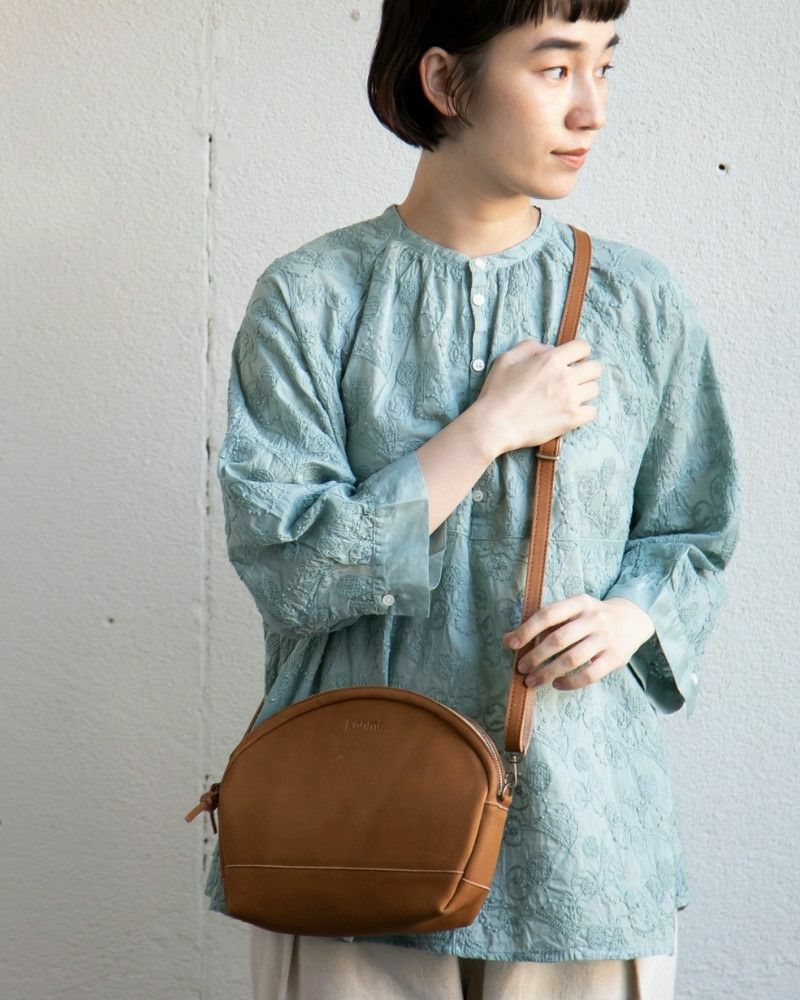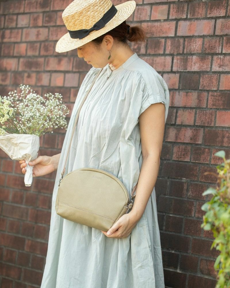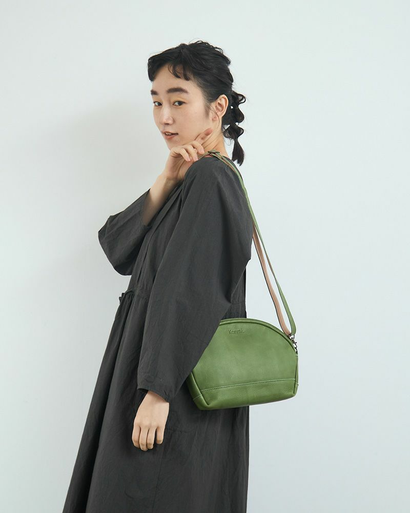 フカフカシリーズが初めての方にも、本革バッグに初挑戦の方にも持ってもらいたい、貝殻みたいなやさしい形のポシェット。やわらかいお色とふかふかの手触りがチャームポイントです。