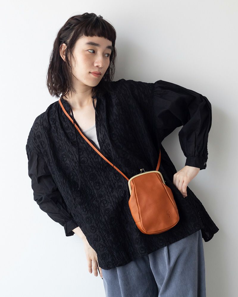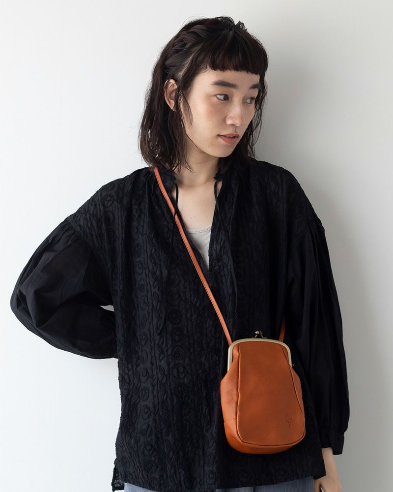 ちょこんと飛び出したショルダー紐を通すベロが、お耳みたいで愛らしい。ぱっと見た時はシンプルに見えるけれど、がま口の金具やショルダー用のお耳が、静かに個性を主張してくれる絶妙なバランスのポシェット。