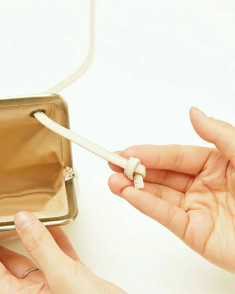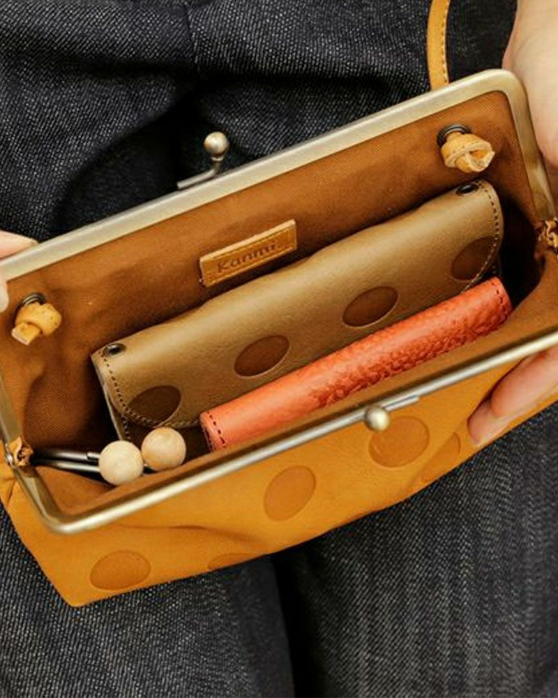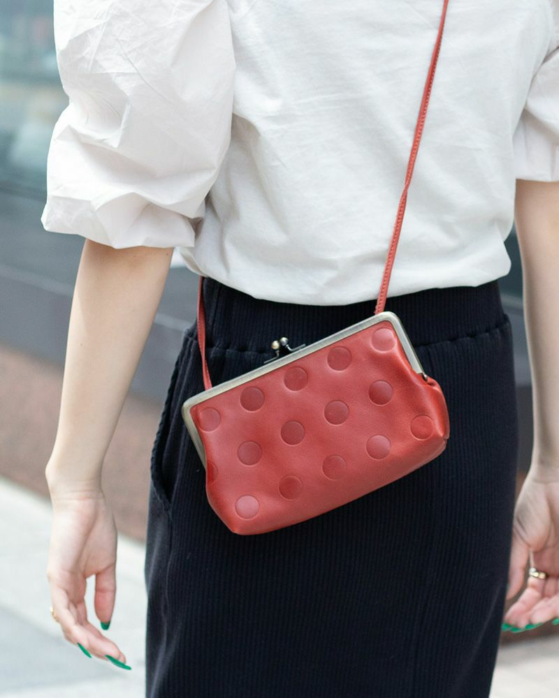 ナチュラルなレザーに大人可愛い水玉模様が入った、がま口タイプのポシェットです。重さはなんとたった150グラム!