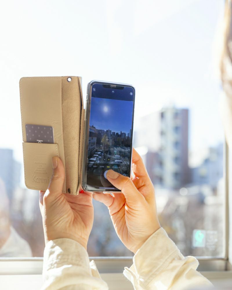 スマホケースについてのアンケートでは「どんな形のスマホにも対応してほしいけど、スライド式は写真を撮るとき不便」というお声が多数。そこで、手帳の部分をぱたんと折りたたむことで、サッとかまえてパッと撮れるスマホケースを作りました。いつもはスナップボタンでスマホ貼り付け部分と手帳がくっついているから、必要なときだけ。