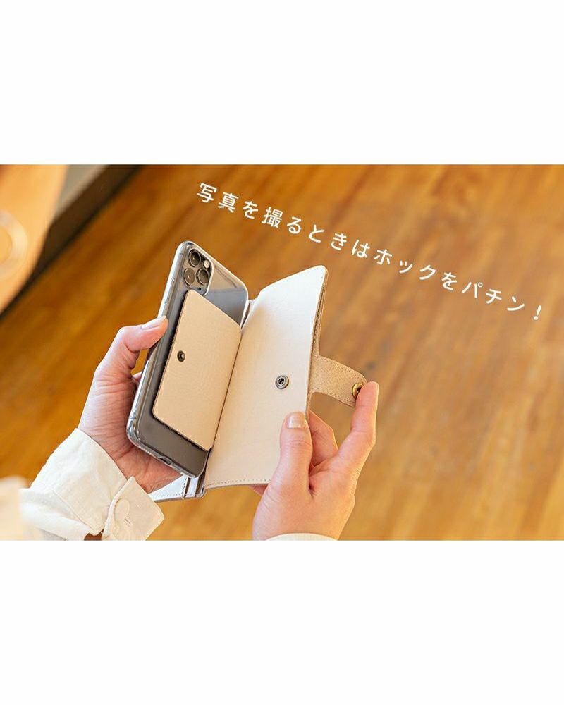 スマホケースについてのアンケートでは「どんな形のスマホにも対応してほしいけど、スライド式は写真を撮るとき不便」というお声が多数。そこで、手帳の部分をぱたんと折りたたむことで、サッとかまえてパッと撮れるスマホケースを作りました。いつもはスナップボタンでスマホ貼り付け部分と手帳がくっついているから、必要なときだけ。