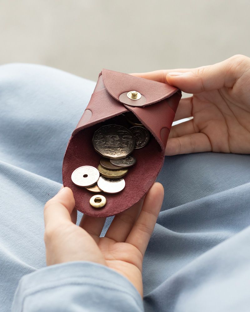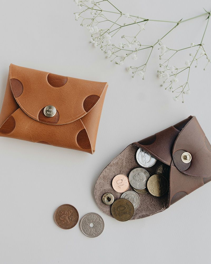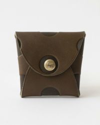 一枚革の左右と下を織り込んで、どこも縫わずに真鍮ボタンで止めた封筒のような小銭入れ。ボタンに押されたKanmi.のロゴがワンポイントに。手のひらにすっぽりおさまるコンパクトさが、愛着を感じさせてくれます。底の幅が少し狭くなっていて、ささっと左右に揺らすとコインが手前に出てきます。蓋にコインを広げれば、中身が見えやすく支払いもスムーズ。
