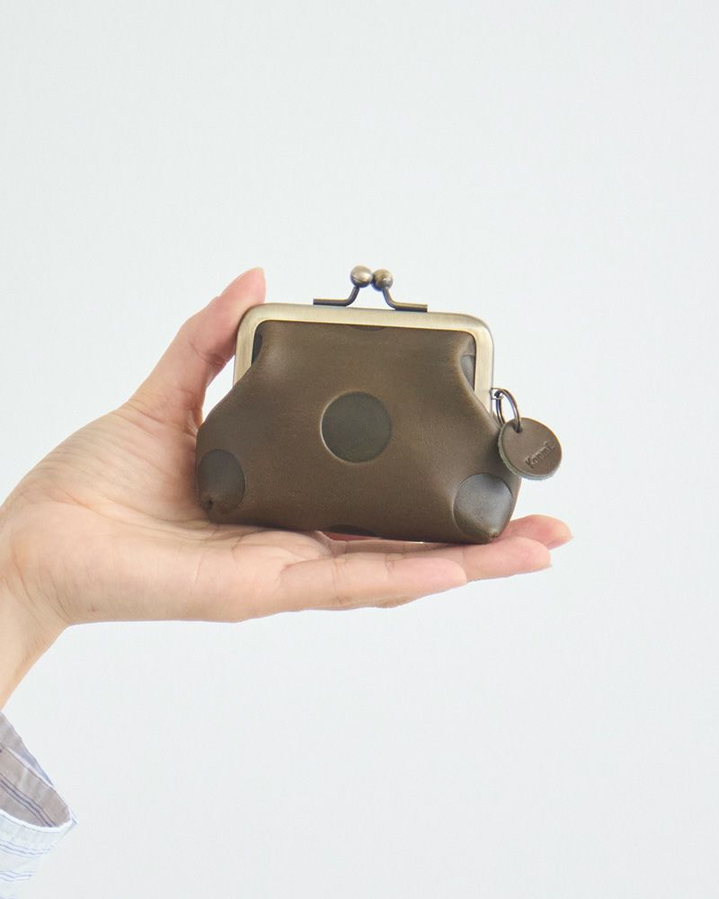 底マチが2センチあり、手の中に収まる小さめサイズ。キャンディの柄とおそろいの、丸い革タグがかわいさを引き立てています。見ているだけで気持ちが弾む、いつも一緒にいたくなるがま口です。