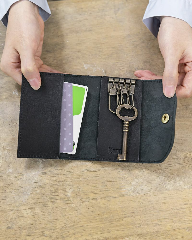 車のスマートキーも掛けられる、大きめのキーホルダーが1つ、家の鍵などにぴったりのふつうサイズのキーホルダーが3つ。定期券や免許証を入れて持ち歩けるカードポケットも1つ付いています。車でも電車でも、スムーズなおでかけをお楽しみください。
