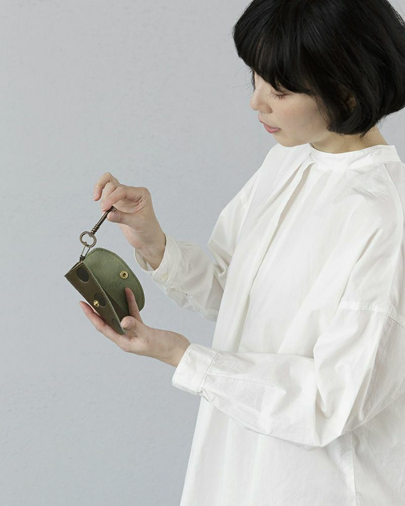 革のキーケースと聞くと無骨なイメージがあるかもしれませんが、こちらのキーケースは凸凹なドット柄に肌なじみのいいカラーが日常にオトナのかわいらしさをプラスしてくれます。