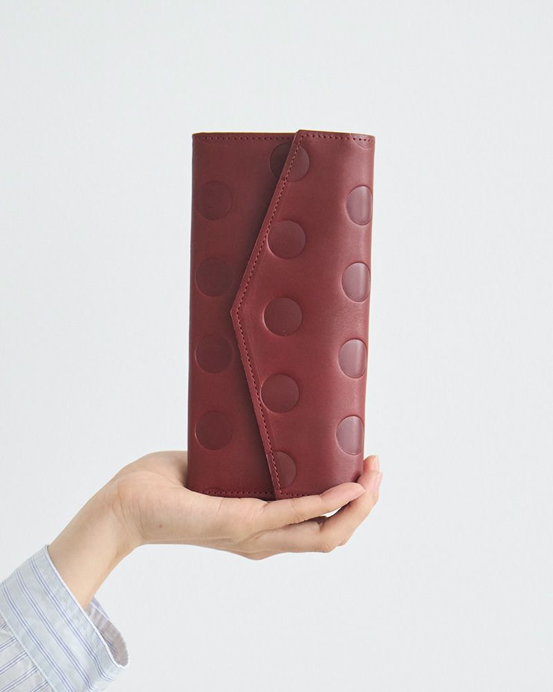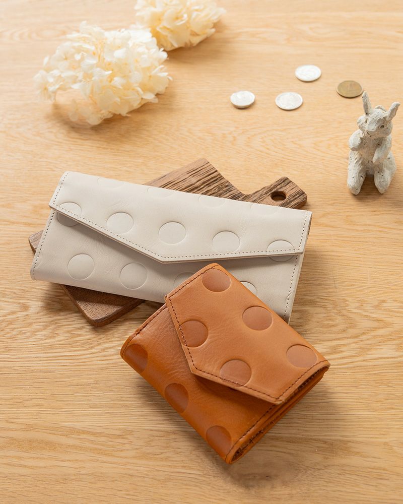 Kanmiオリジナルの水玉「キャンディシリーズ」は丸の大きさや間隔、配置にまでにこだわって作りました。ホックもKanmiオリジナルロゴ入り。 牛革に型押ししていますので、沈み込んだ部分とのコントラストが魅力です。