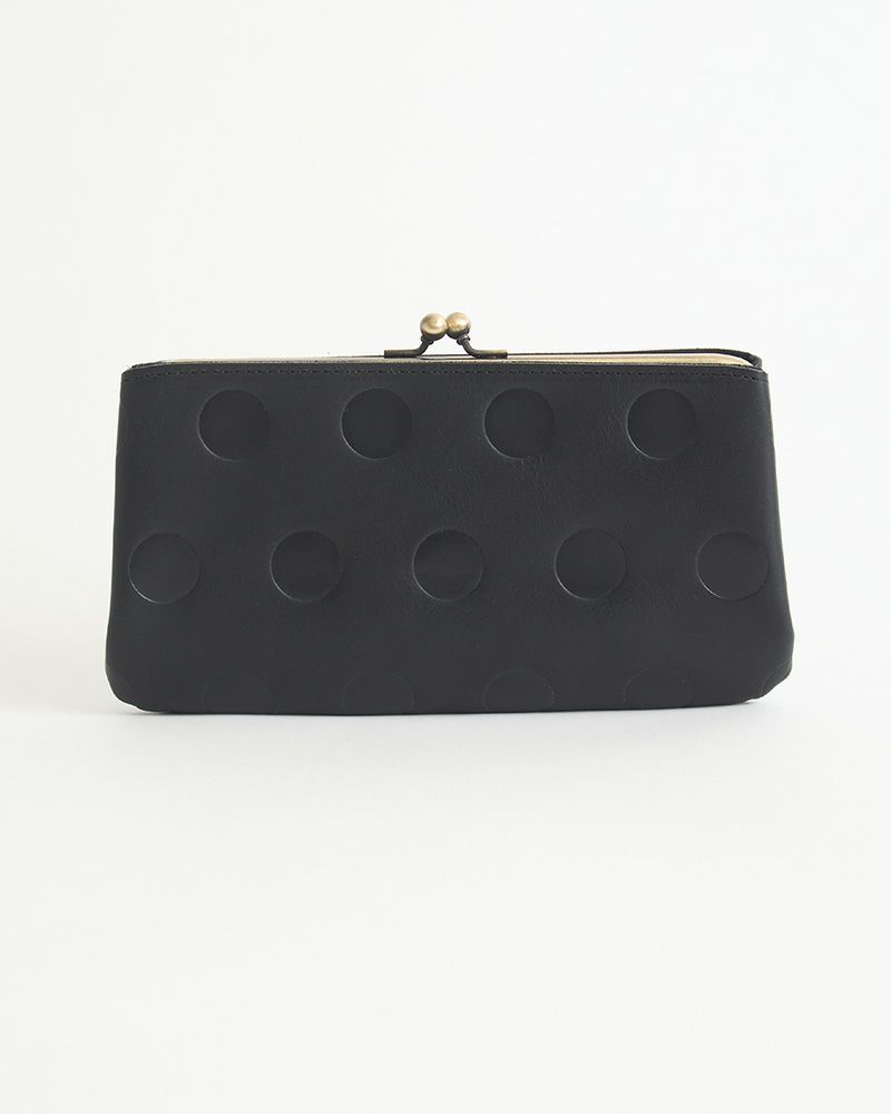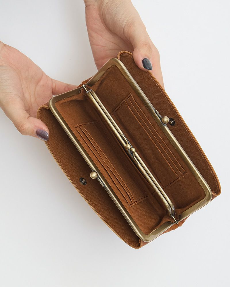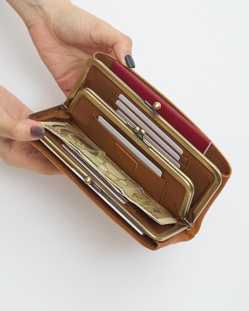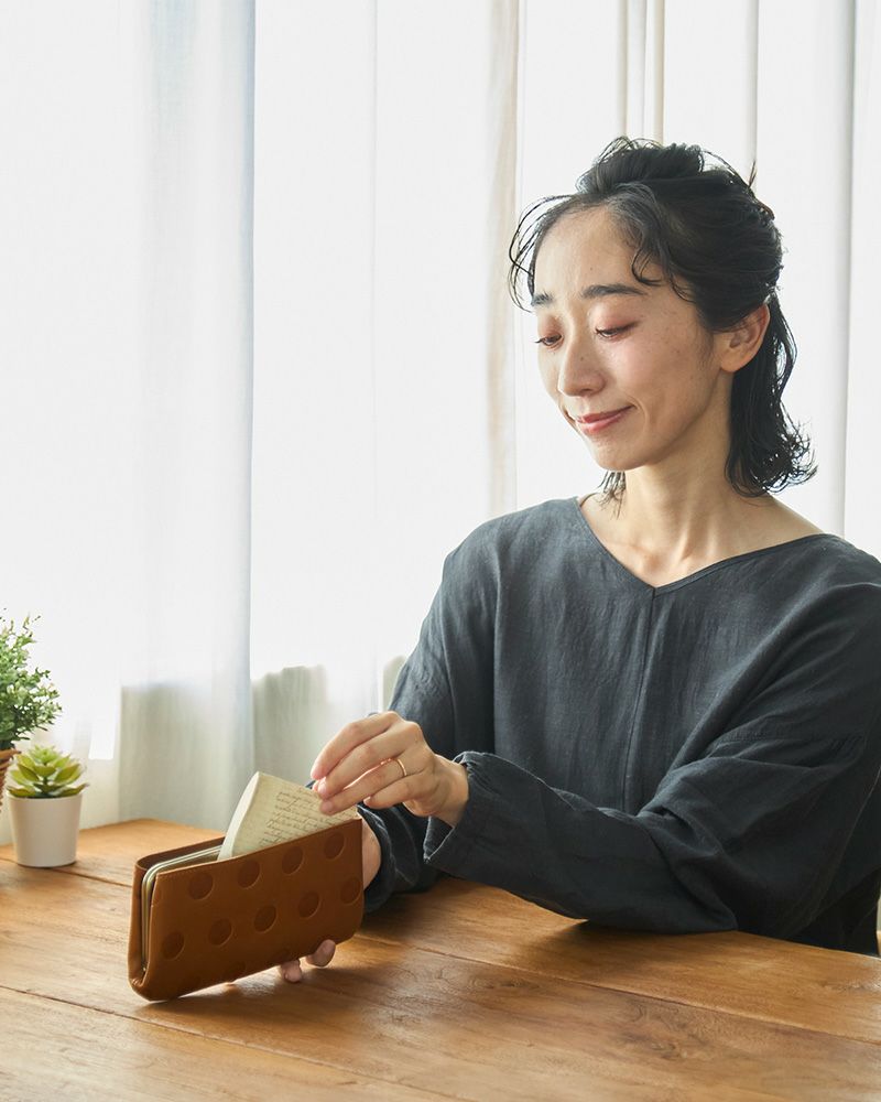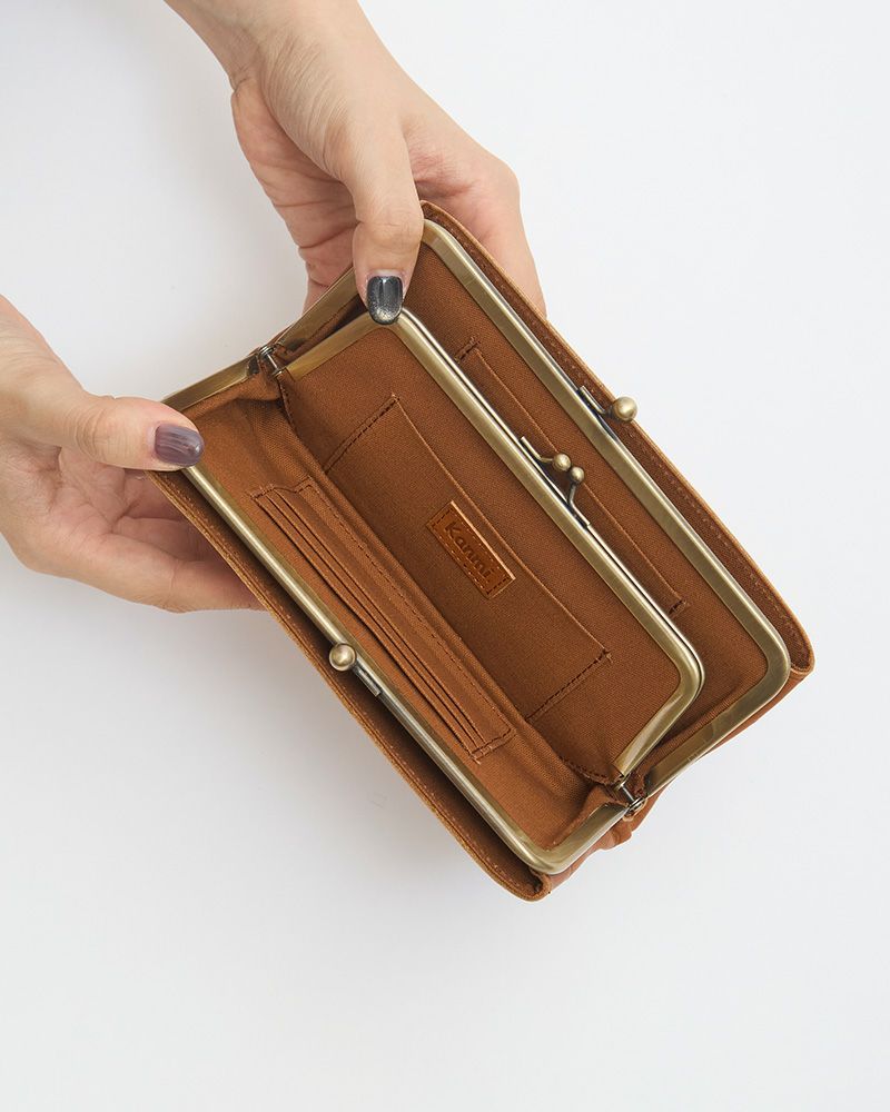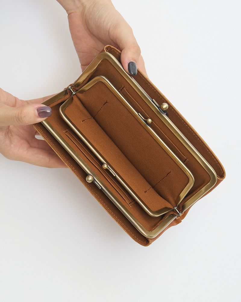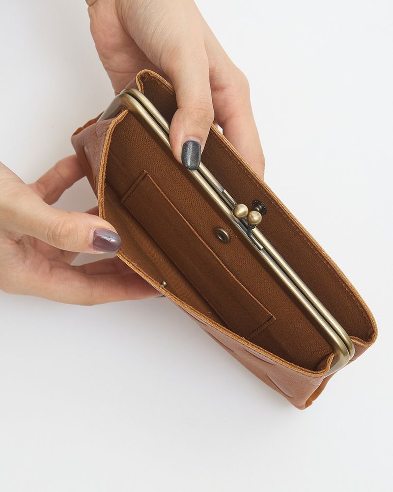 あおりポケットが両側についた、がま口タイプ。あおり部分にゆとりがあるので、領収書や小さなメモ帳、通帳と印鑑のセットも、ホックボタンを開けたまま収納が可能!取り出しやすく、入れたものが見やすいのもポイントです。