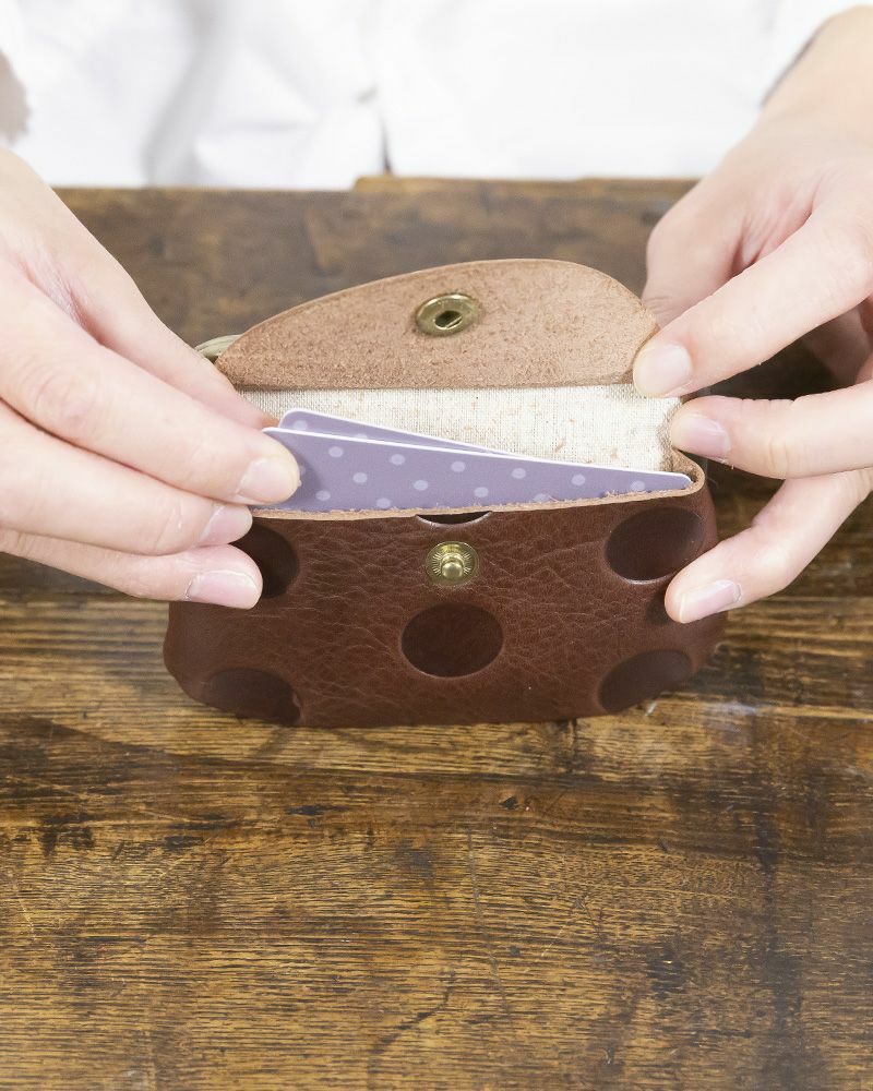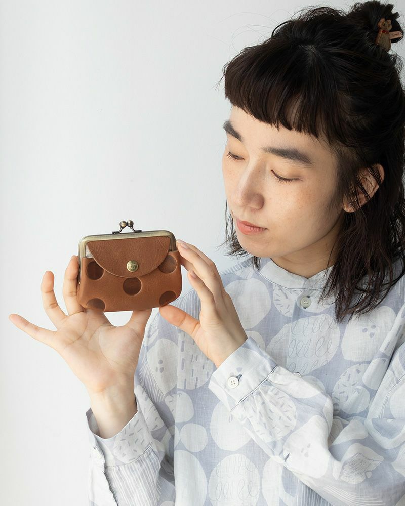 やわらかな本革は、指先にしっとりなじんで、持つだけで自然と気持ちが整う感覚。ドット柄の型押しが、落ち着いた可愛さを添えてくれます。