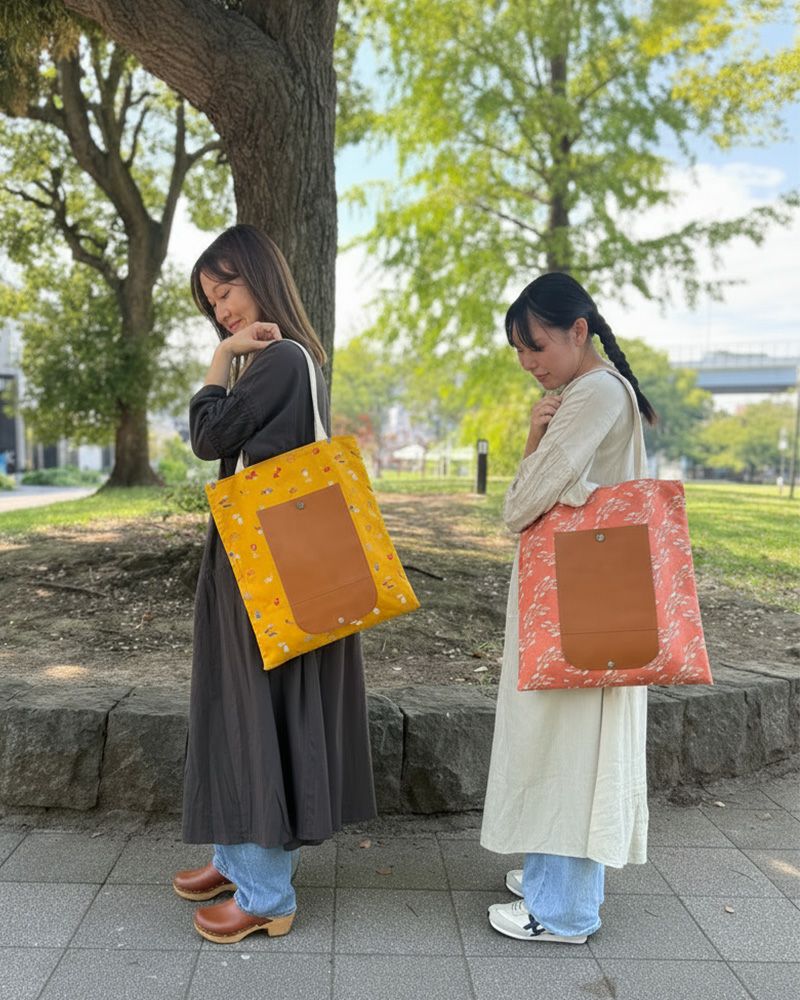 カラフルな柄は、朝の散歩道では軽やかに、昼さがりの図書館では落ち着きを添えて。シンプルな装いの日も、バッグひとつで気持ちが少し弾む。さらに、革のポケットを使ってくるりと折りたためるから、旅行やお買い物のサブバッグとして持ち歩くのにも便利です。革の安心感と布の遊び心が混ざり合い、何気ない毎日を小さな物語に変えてくれます。