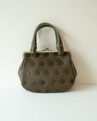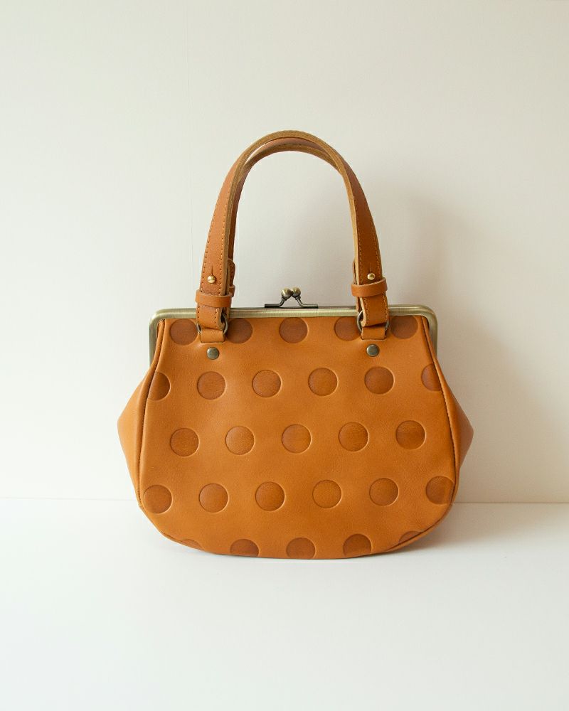 コロンとまるいフォルムがなんとも個性的なバッグです。 少し太めの持ち手もバランスよく見せてくれるポイント。 無地のTシャツでも、総柄のワンピースとあわせても、ふしぎと上品に決まる大人の水玉模様です。 鏡にうつった自分の姿に気分が上がる、そんなバッグです。