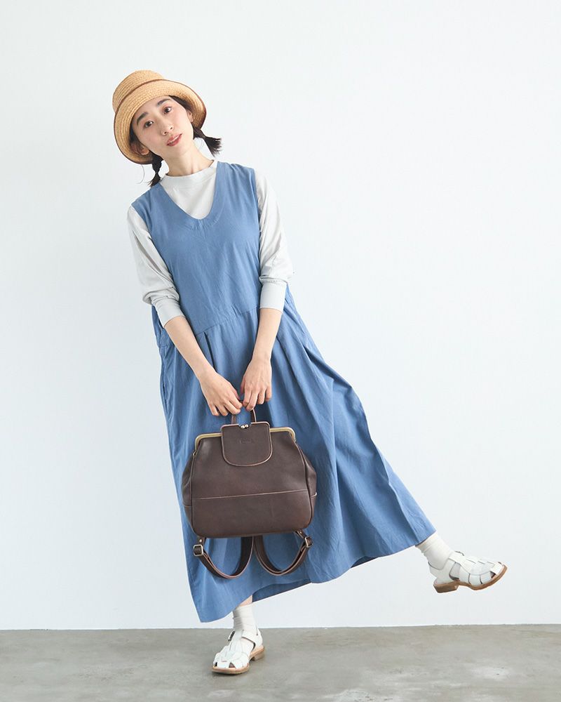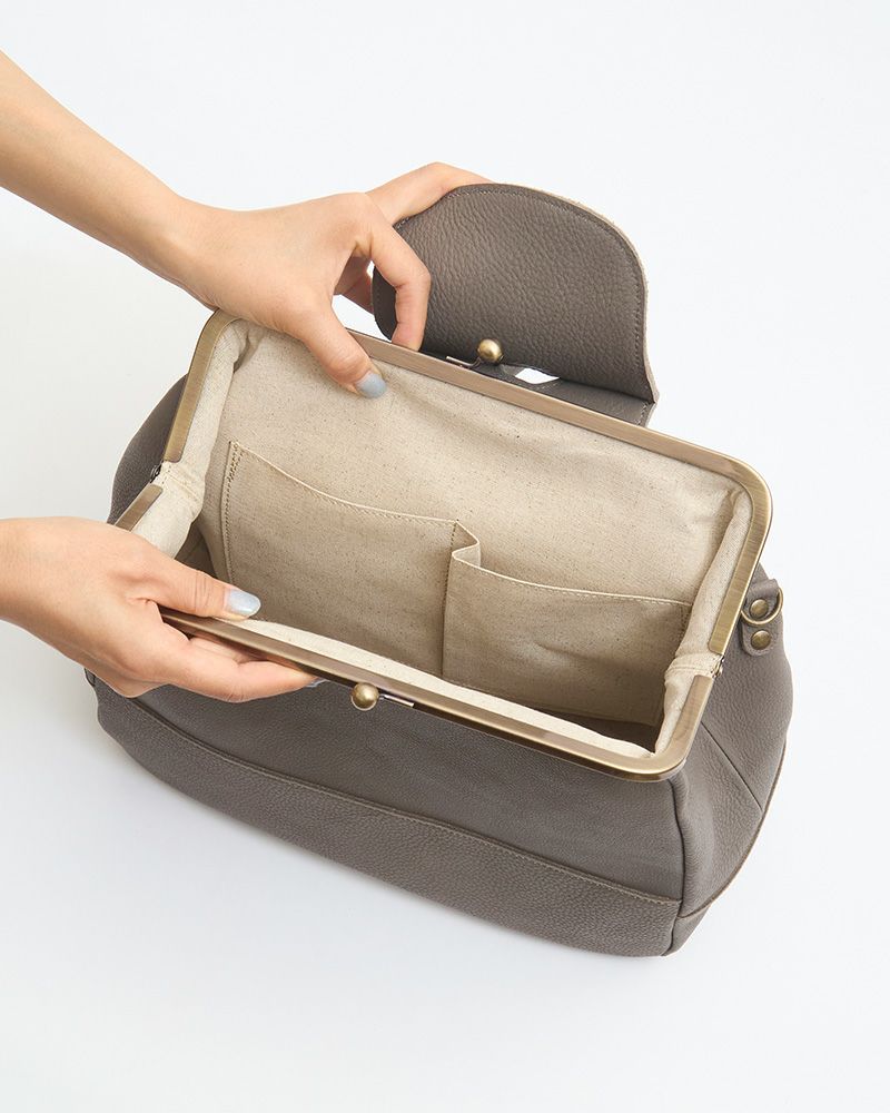 しっかりした革とがま口が付いているのに、見た目よりも軽いので毎日使いにもおすすめ。 小さく見えるのに底マチが13センチ程あるので、細いお弁当箱や500mlのペットボトルも入れられます。 通勤や移動の時はリュックとして、商談などのフォーマルな場所へ行く時はハンドバッグとして手持ちにできる優れもの。