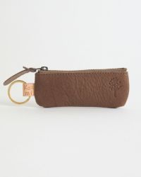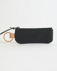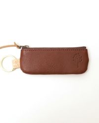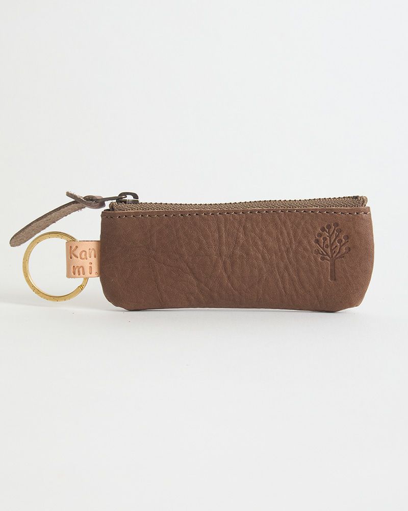横長のポーチの右側にはドロップツリーが。キーリングとポーチを繋ぐヌメ革に押されたKanmi.のロゴも目立ちすぎずさりげないアクセントになっています。
