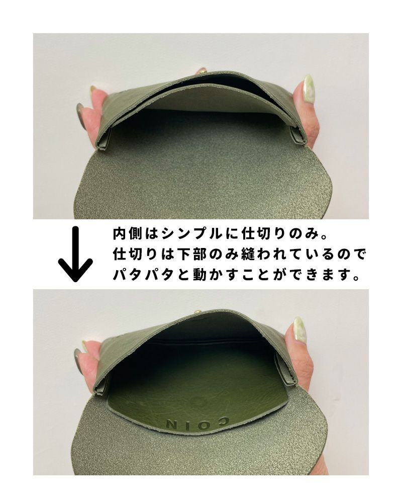 蓋を開くとラウンドにカットされた革からCOINと文字がちらり。左右を指で挟むと口が大きく開くので、手前に入れたコインが見やすく、ささっと揺らすと奥のコインが手前に移動してくれます。 仕切りが動くので、お札やカードが取り出しやすいのも特徴。