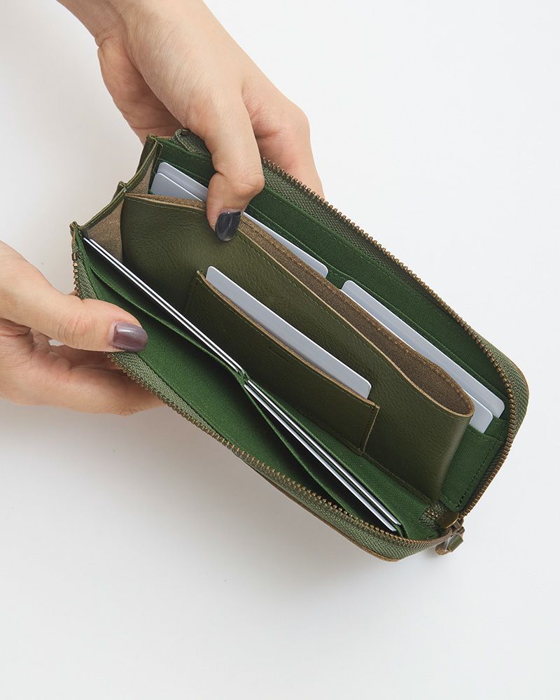 L型ファスナーを開くと、中身が一目瞭然。「お札を折らずに入れたい、でも薄い方がいいな」という方にぴったり。軽くて使いやすくて、お札は綺麗なままが嬉しい。色々なご要望にお応えする、Kanmi.の定番人気シリーズです。