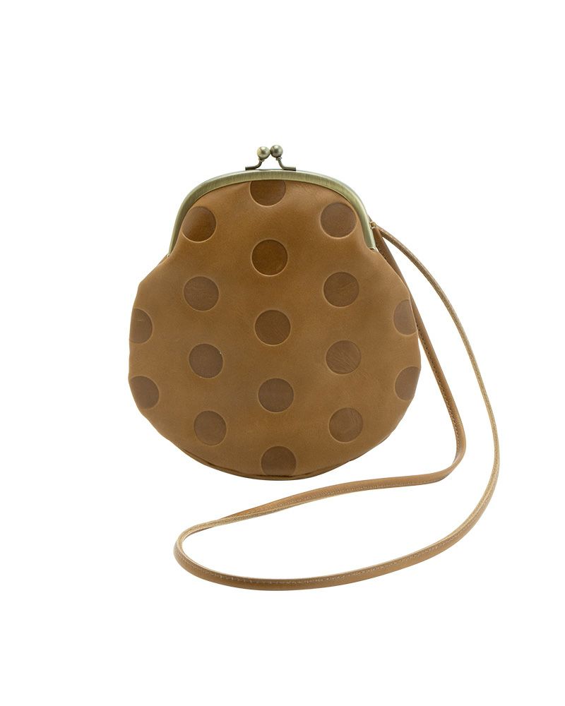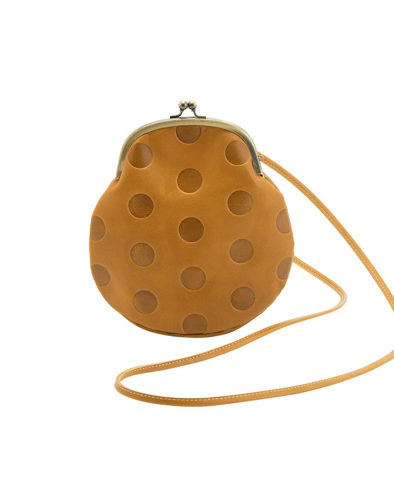 ナチュラルなレザーにキャンディのような水玉模様が大人ガーリーながま口です。手のひらサイズがちょうど良い。大きながま口を開けると小さながま口が入っている親子がま口。お財布以外にも、ポーチやアクセサリーケースとしてもお使いいただけます。