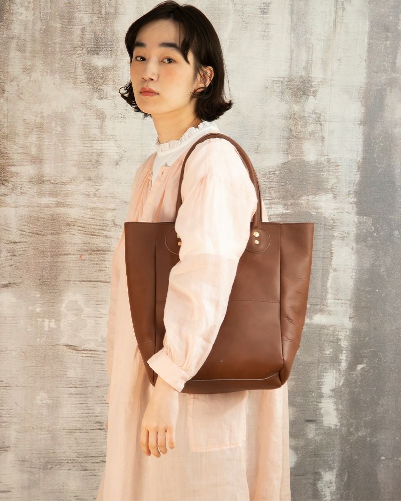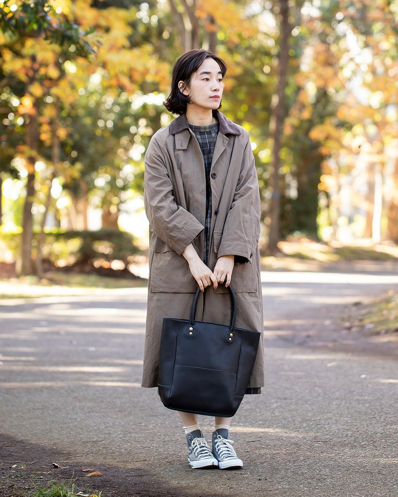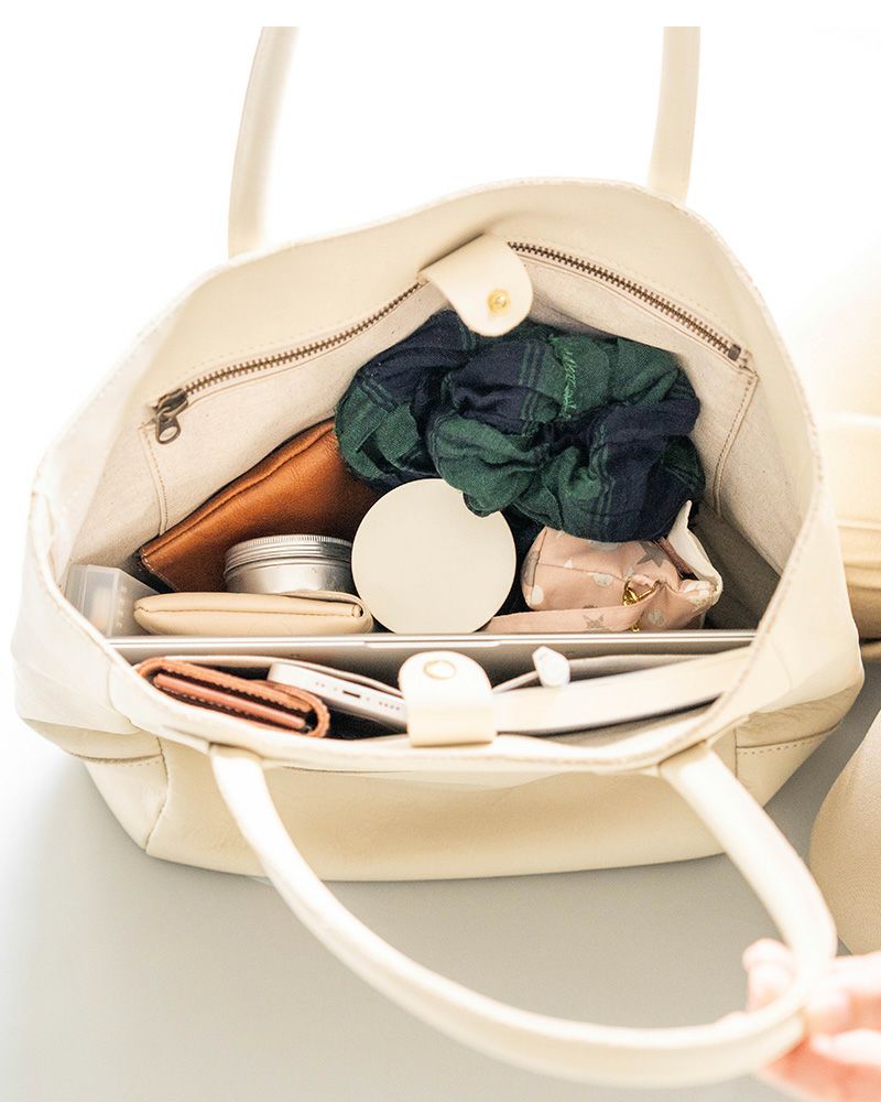 縦長デザインで13cmとたっぷりのマチ。A4サイズの書類や、タブレット、手帳、お財布、キーケース、500mペットボトルを入れても、まだ余裕があるから、お仕事用や、学校用などいつものお出かけにも活躍してくれます。