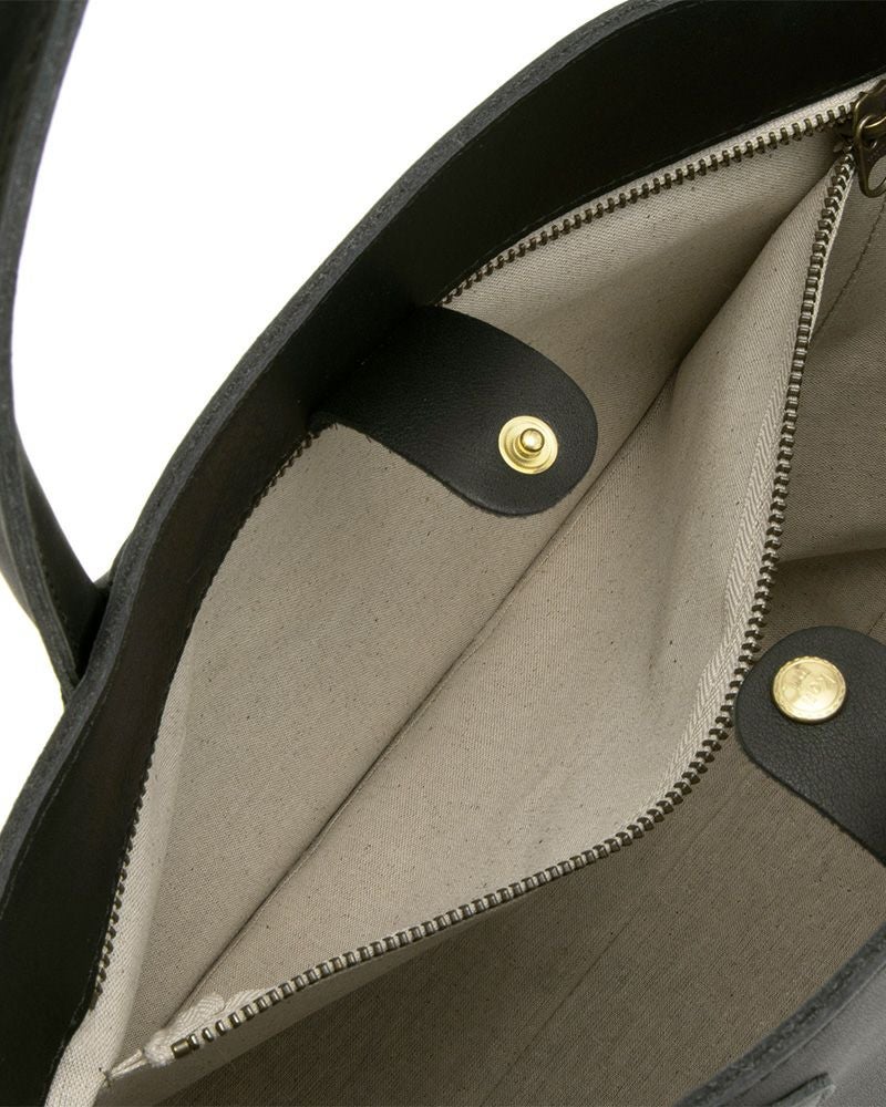 中にオープンポケット2つに。大きめファスナー付きポケットが1つ。オープンポケットには、使用頻度の高いスマホやハンカチなどを。オープンポケットなのでさっと取り出せるのが嬉しいポイントです。反対側のポケットには、お財布やカギなどの貴重品をいれると◎ファスナー付きだから安心感があります。