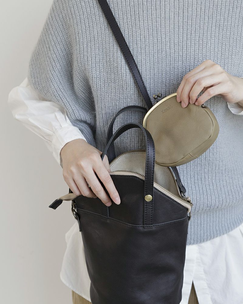 山なりのフォルムと筒のような形にこだわってつくった、縦長い形のバッグ。 長財布やペットボトル、折りたたみ傘などが縦に入るから、なにがどこに入っているのか見やすいのが嬉しいポイント。