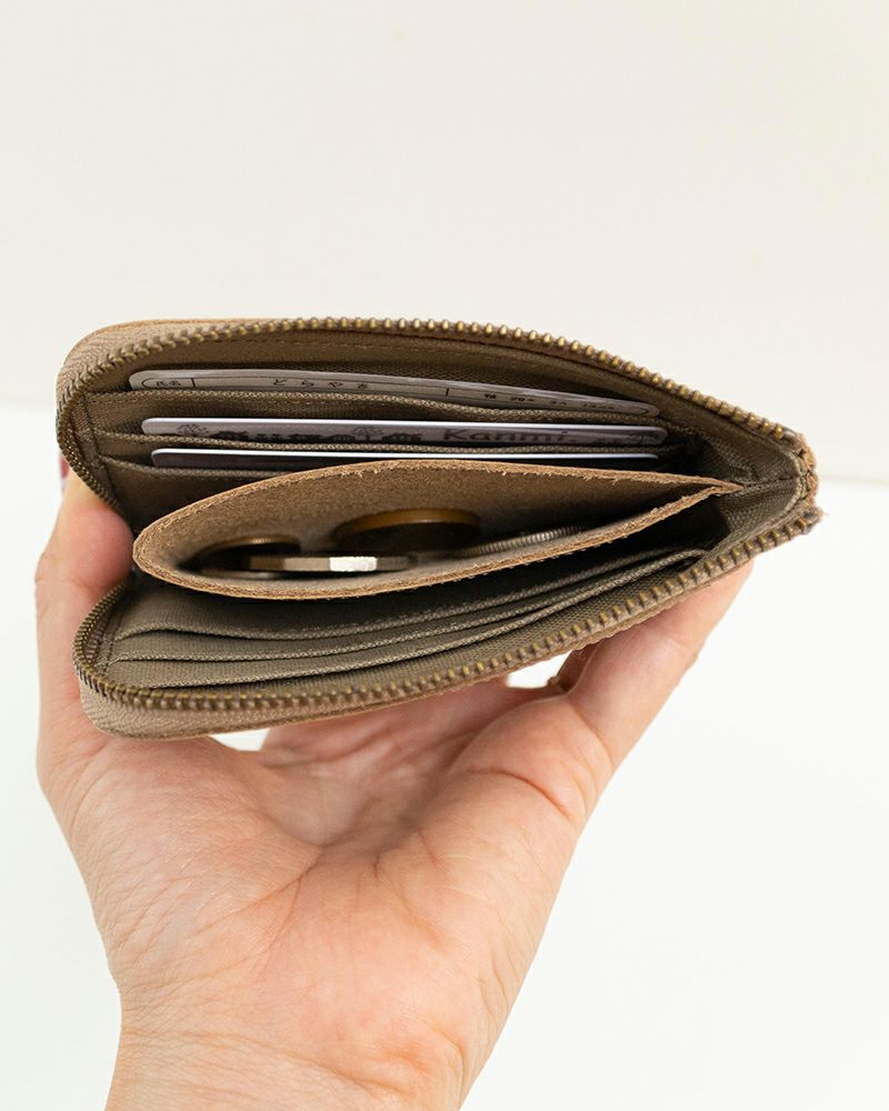 手にすっぽりおさまる薄さとサイズ感。カードポケットは6つ付いて、意外と収納上手なんです。お札は二つ折りでぴったり入ります。お財布をコンパクトに整理整頓したら、気持ちもすっきりしそう。