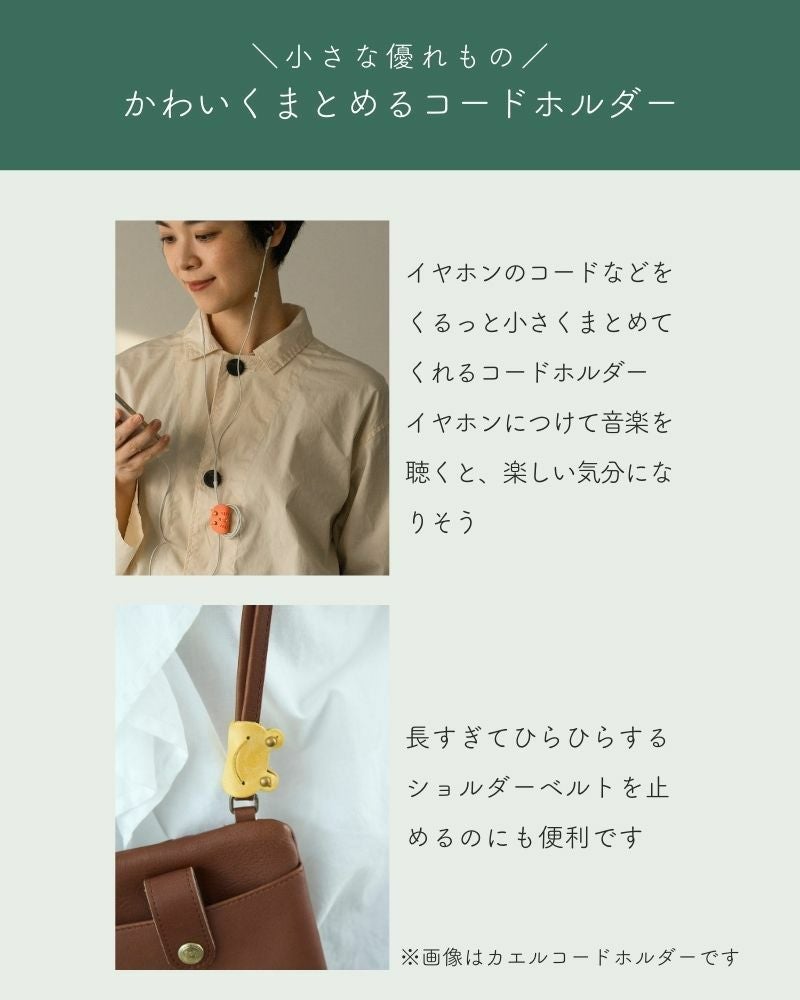 イヤホンのコードなどをくるっと小さくまとめてくれる、ネコのコードホルダー。コードやイヤホンの長さ調節ができます。カラフルで愛嬌のあるどうぶつ達をみているだけで、ぱっと気持ちが明るくなります。ベテランのカエルさん、ネコさんに、新人のクマさんが加わりました。