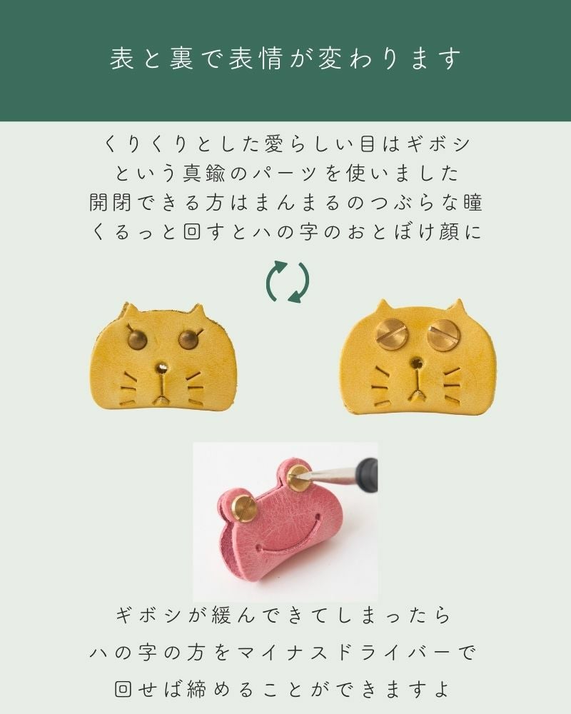 くりくりっとした愛らしい目は、ギボシという真鍮のパーツでできています。開閉できる方はまんまるのつぶらな瞳。くるっと回すと、ハの字のおとぼけ顔に。ギボシが緩んできてしまったら、ハの字の方をマイナスドライバーで回せば締まります。(下記画像はカエルコードホルダーの写真になります)
