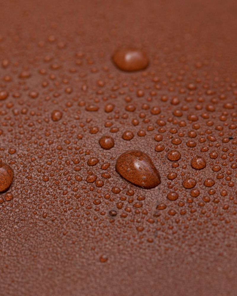 しっとりとした高級感があるレザーにスコッチガードという防水加工を施してあるので、天気や汚れを気にせずいつでも使っていただけます。水をはじくので雨の日でも、ささっと出し入れできる外側ポケットにスマホを入れても大丈夫。