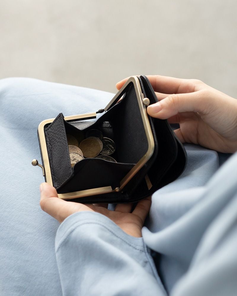 ぱかっと大きく開くボックス型のがま口は、中身が一目で見渡せて、小銭もスムーズに出し入れできます。ちょっと足りないときは、がま口を開けたまま横からお札をすっと取り出せて、なんともスマート。