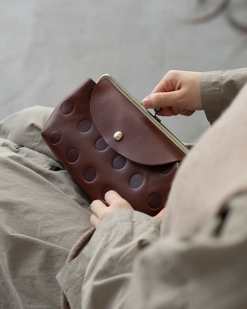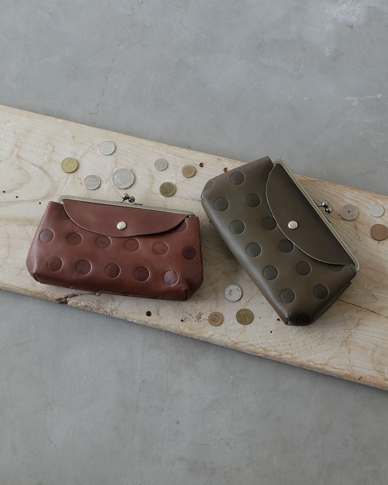 Kanmiオリジナルの水玉「キャンディシリーズ」は丸の大きさや間隔、配置にまでにこだわって作りました。ホックもKanmiオリジナルロゴ入り。 牛革に型押ししていますので、沈み込んだ部分とのコントラストが魅力です。