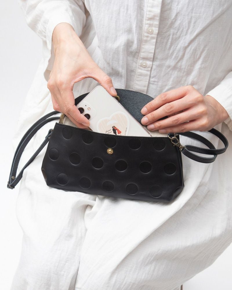 ショルダー紐を外すとクラッチバッグになるので、おでかけファッションに合わせて、結婚式や入学式、卒業式へ。水玉のワンピースとバッグの水玉を合わせた水玉模様コーデでママ友とランチ会にも。おめかしして出かけたい特別な日にどうぞ。