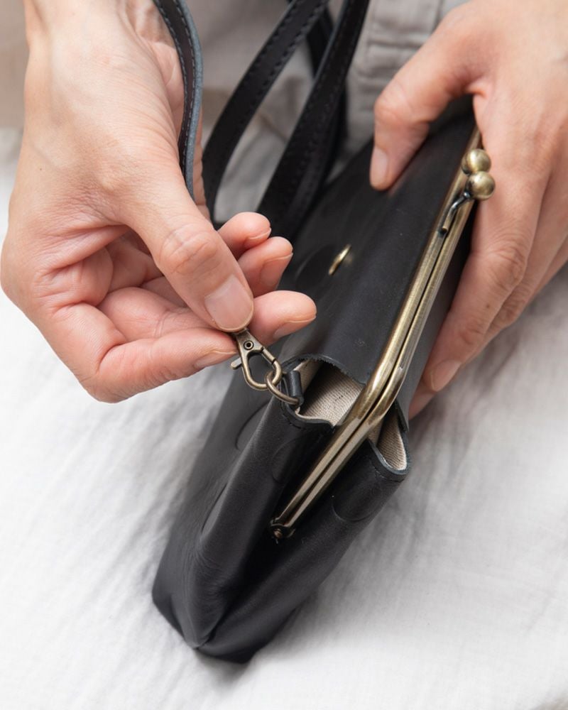 両面にホックで留まるポケットがついた、がま口財布ショルダーです。外側には両面にフタつきポケットがあり、レシートや鍵、定期券などを入れておくのに便利。常備薬やおまもり、クーポン券、カード類、鍵…などなど忘れずに持っていきたいちょっとした小物が入れられます。表のポケットにはスマホを。