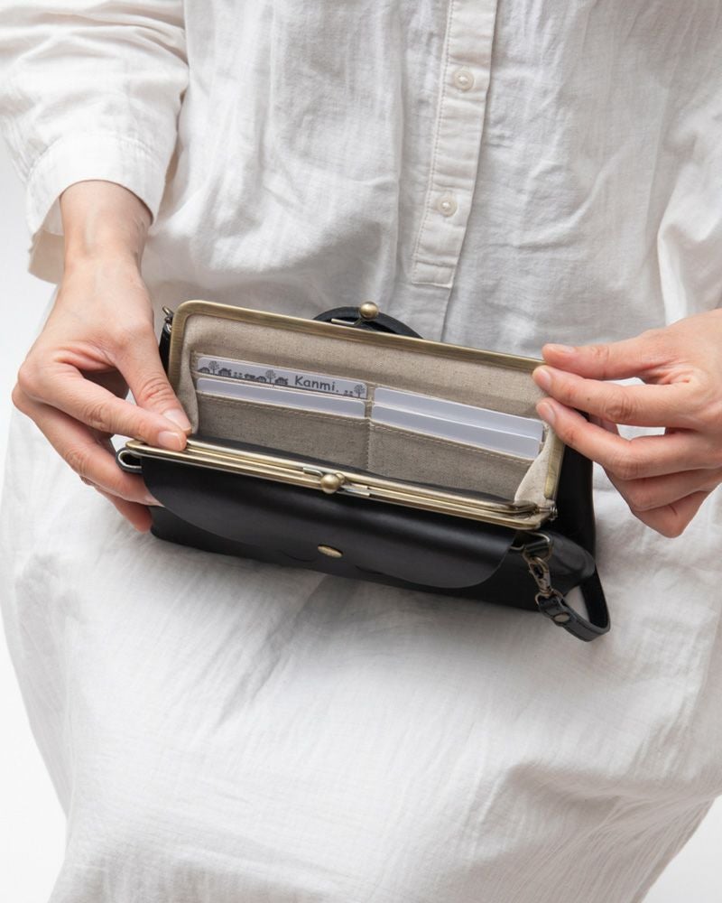 とってもとーっても大きめサイズのお財布として使えます。がま口をパカっと開くと、真ん中には小がま口、カード入れが2ヶ所。カードは8ヶ所に分けて入れられるので、ポイントカードなどをたくさん持ちたい方にぴったり。小がま口には小銭をどうぞ。どれだけレシートやポイントカードが増えてもすっぽり受け入れてくれる、懐の深いお財布です。