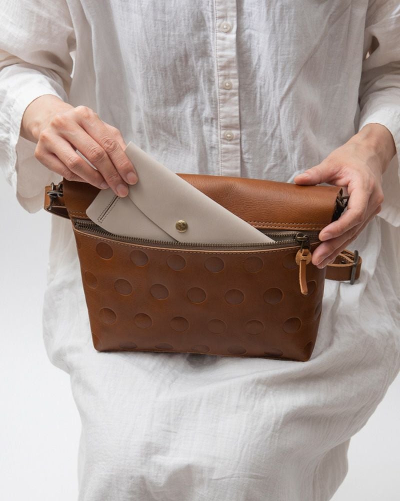 キャンディみたいな水玉模様はKanmi.オリジナル。丸の大きさ、間隔、配置までこだわって作った水玉もようがふっくらと型押しされています。 牛革に型押しし、沈み込んだ部分が少し濃い色でコントラストが魅力です。 ポコポコとした手触りもなんだかほっこりとさせてくれます。 傷付きにくいサラサラな本革は、使い込むとしっかりツヤがでて、より愛しく感じさせてくれます。ケア用品のBee エイジングオイルと相性◎