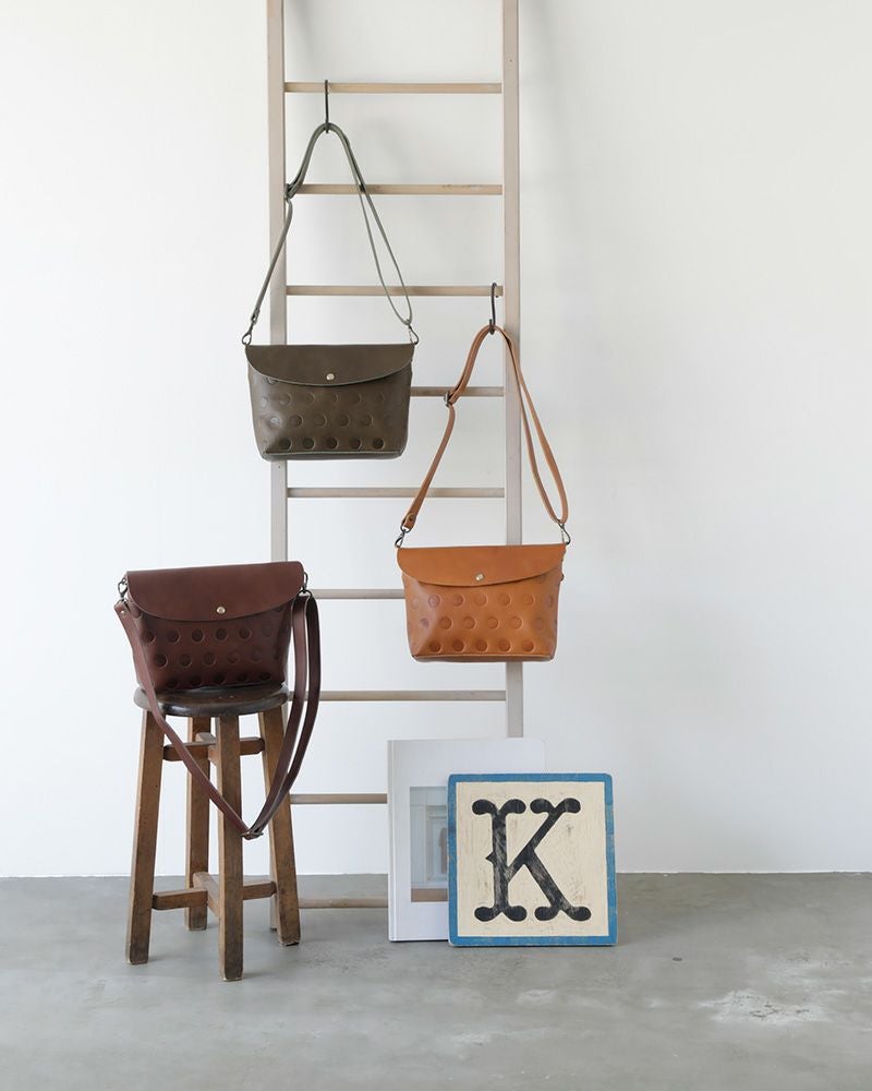 キャンディのかわいらしさと、頼りになるきりっとしたかっこよさが合わさったショルダーバッグ。かわいすぎず、かっこよすぎず、そのバランスが絶妙です。 7センチと細めのマチと台型のカタチ、しっかりした張りのある革の組み合わせがシュッとした印象。フラップを短くしてあるので、水玉模様がたくさん見えるのもかわいさのポイントです。